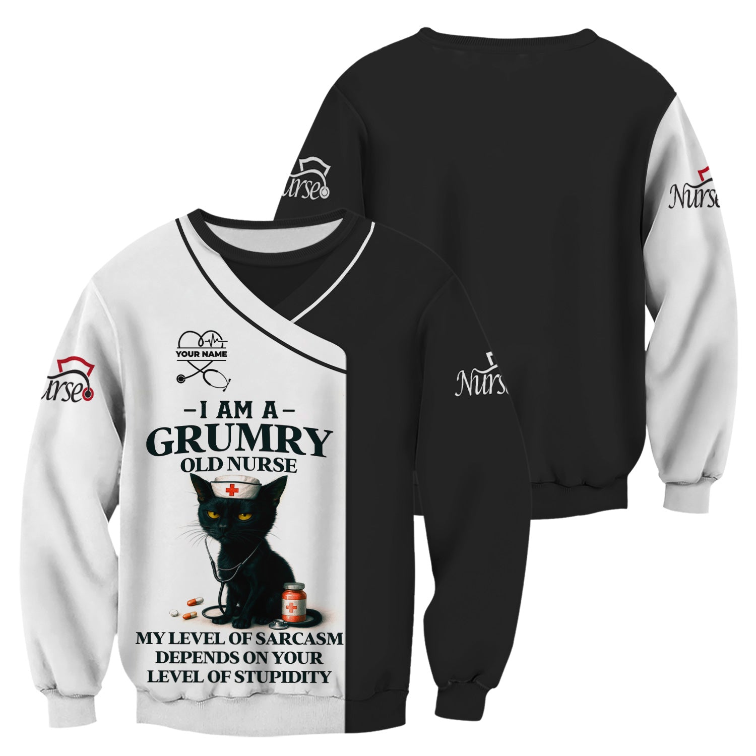 Grumpy Old Nurse Scrub Shirt with Sarcastic Black Cat Design - I Am a Nurse Of Course I'm Grumpy Quote - Gift for RN CNA LPN Healthcare Workers