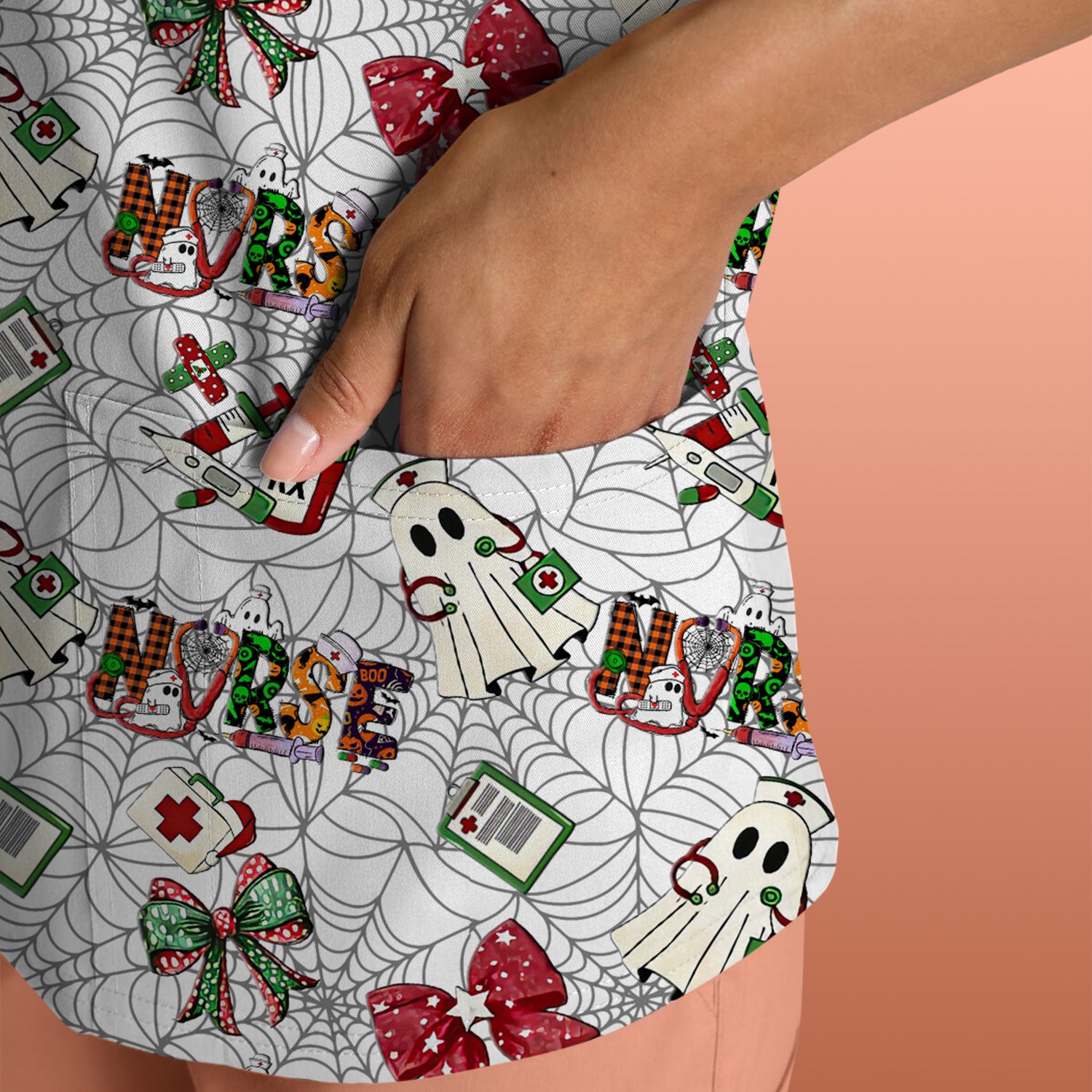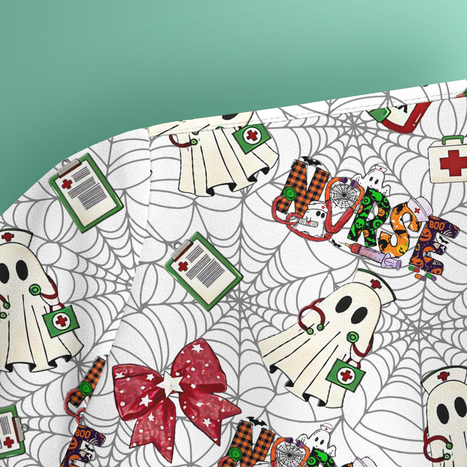 Halloween Nurse Scrub Top for Women - Cute Ghost and Spider Web Scrub Shirt Multi Color - Funny Nursing Work Shirt with Pockets