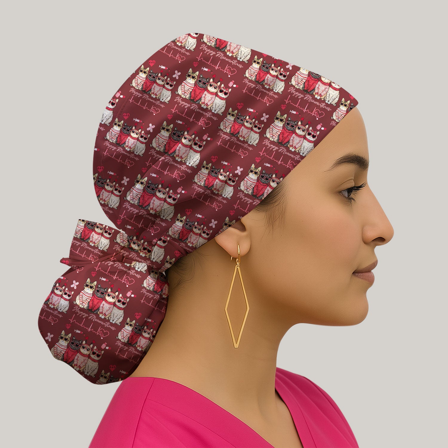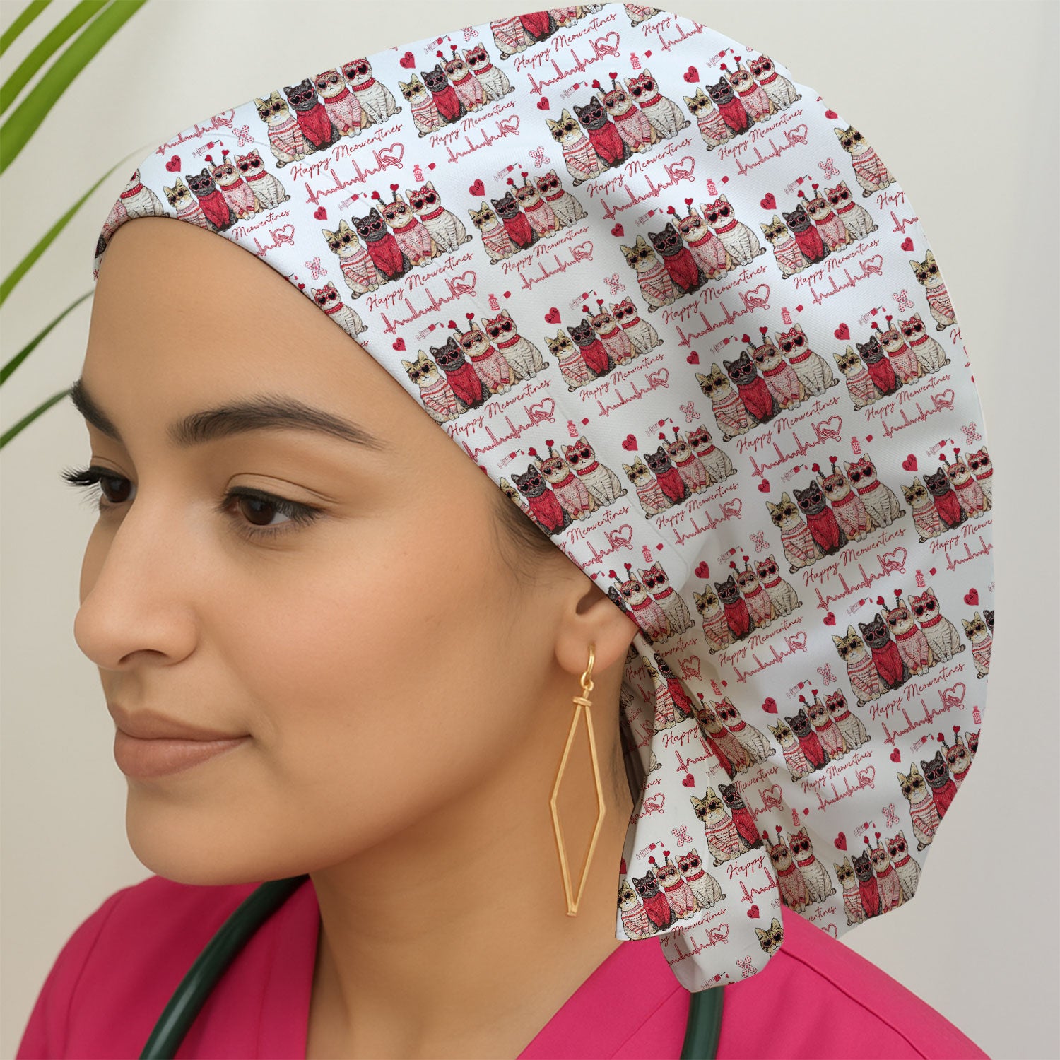 Happy Meowtines Cat Pattern Scrub Cap, Valentine Cat Lover Nurse Scrub Hat, Heartbeat Medical Pattern Nursing Uniform
