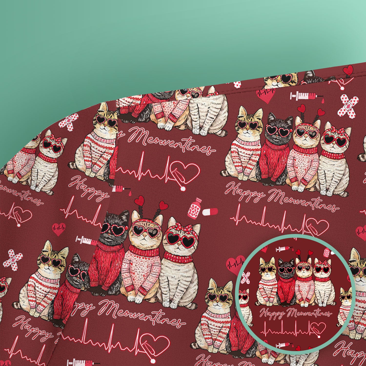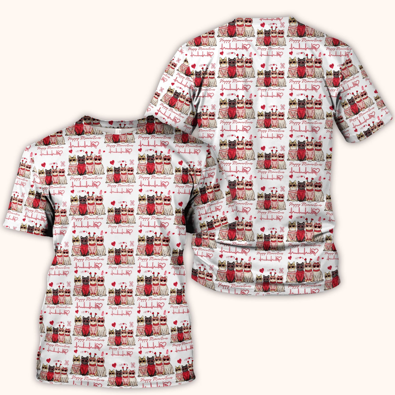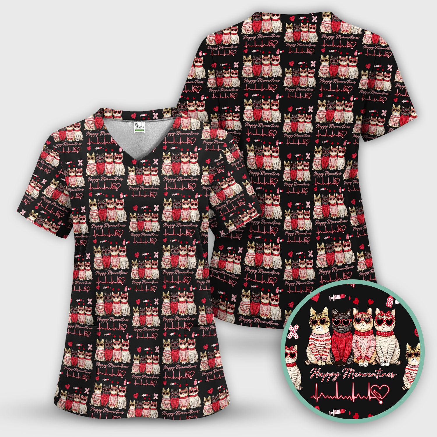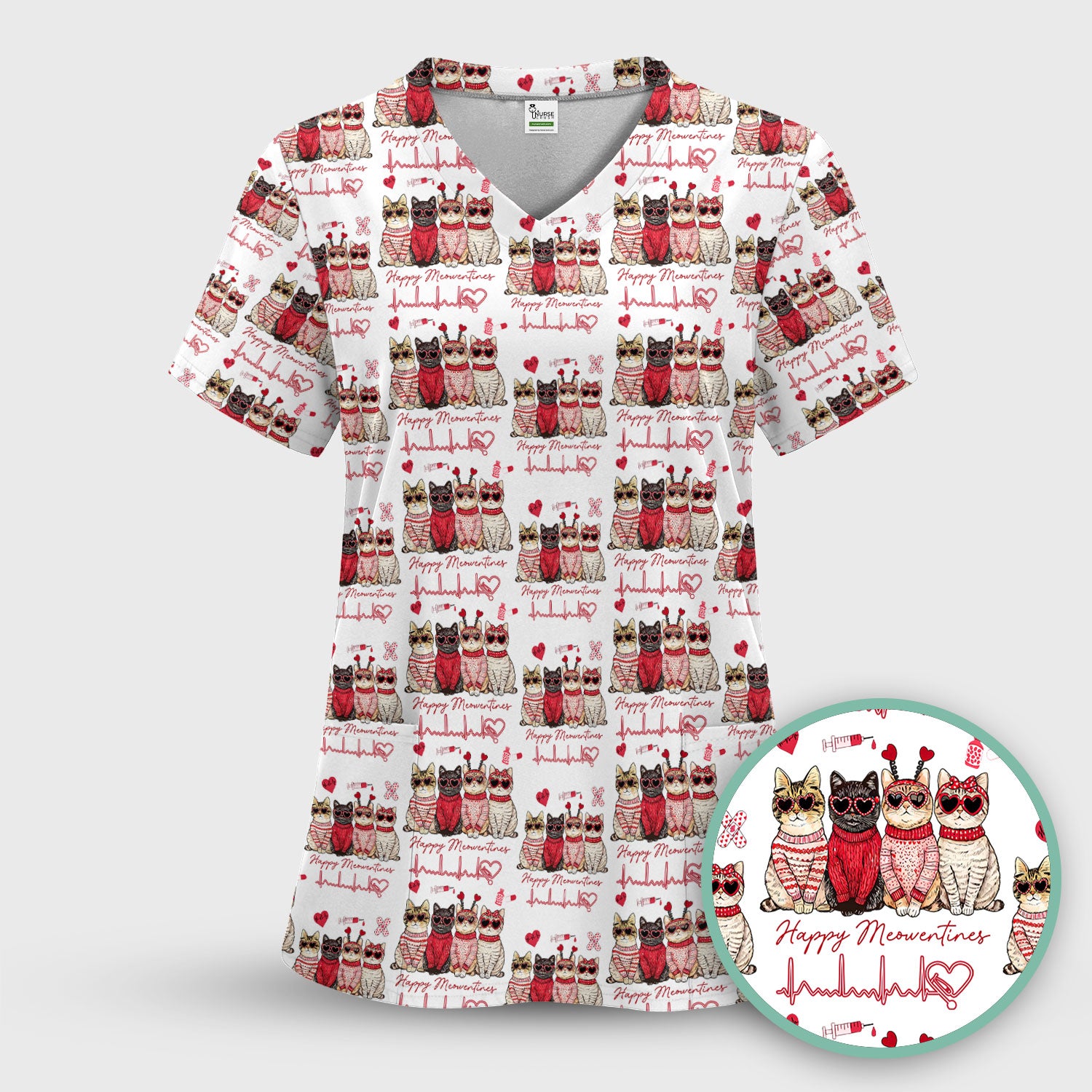 Happy Meowtines Cat Pattern Scrub Top, Valentine Cat Lover Nurse Scrub Shirt, Heartbeat Medical Pattern Nursing Uniform