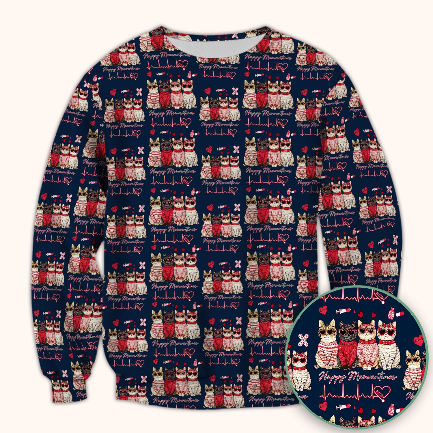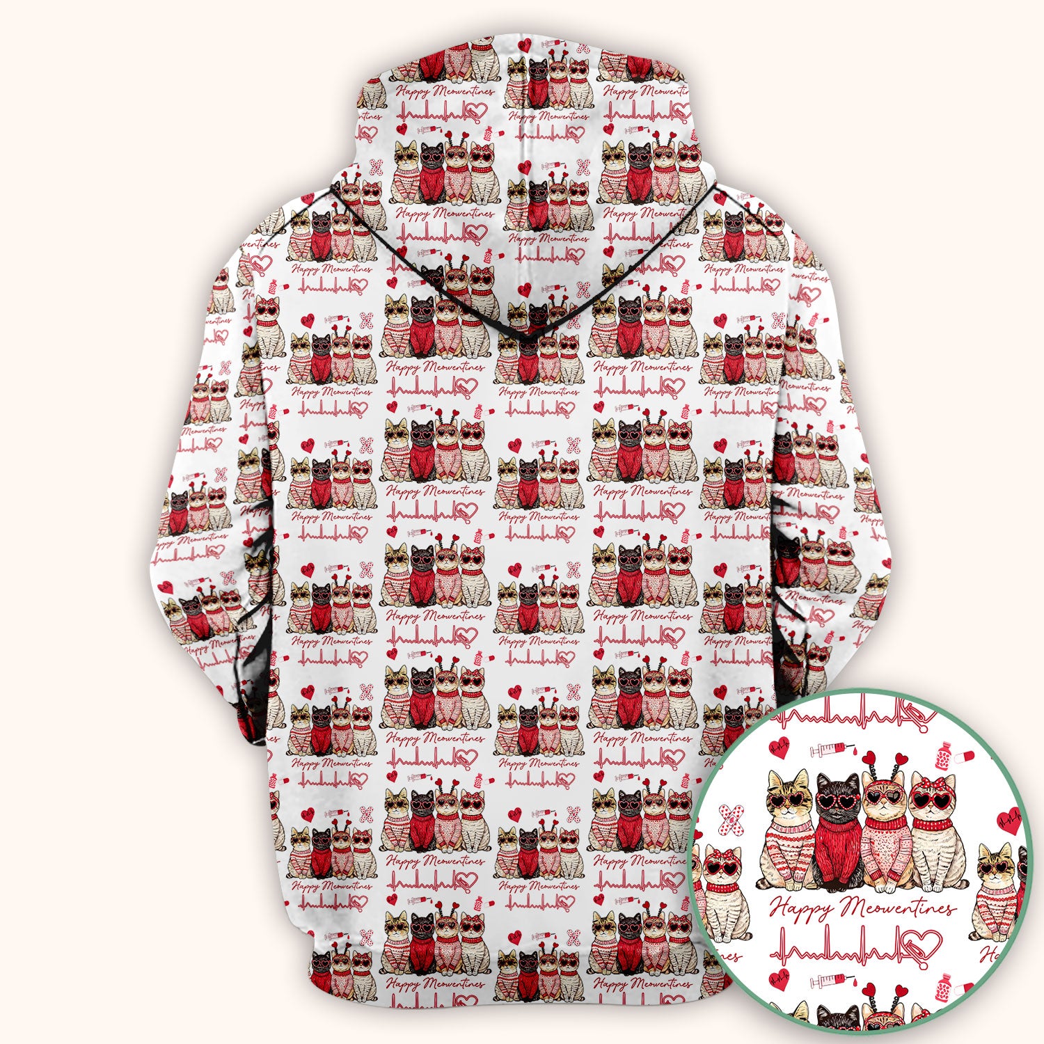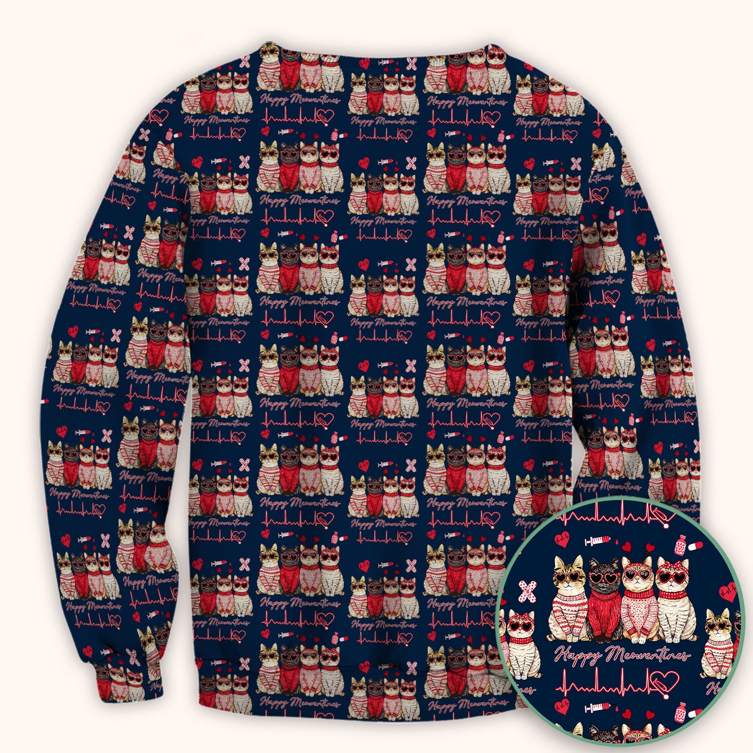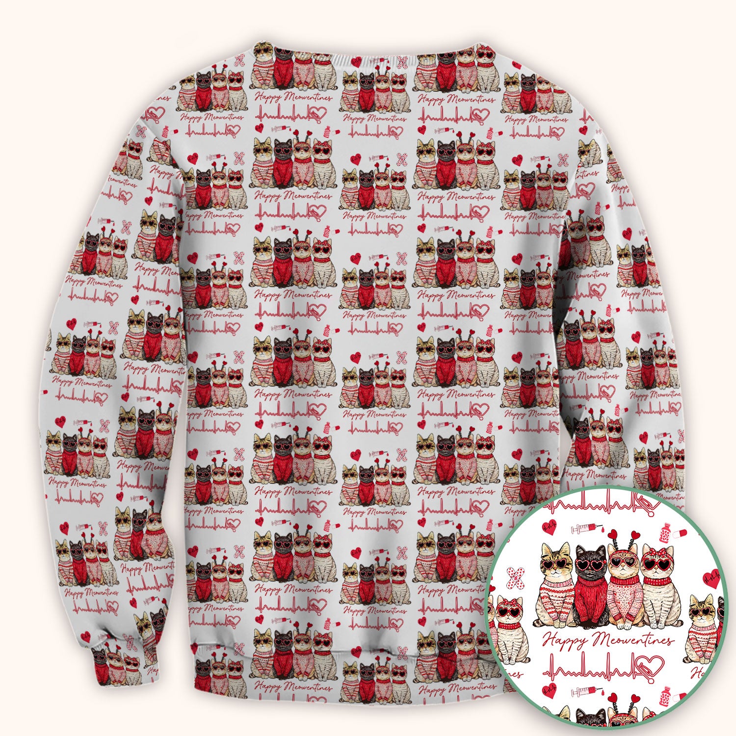 Happy Meowtines Cat Pattern Scrub Top, Valentine Cat Lover Nurse Scrub Shirt, Heartbeat Medical Pattern Nursing Uniform