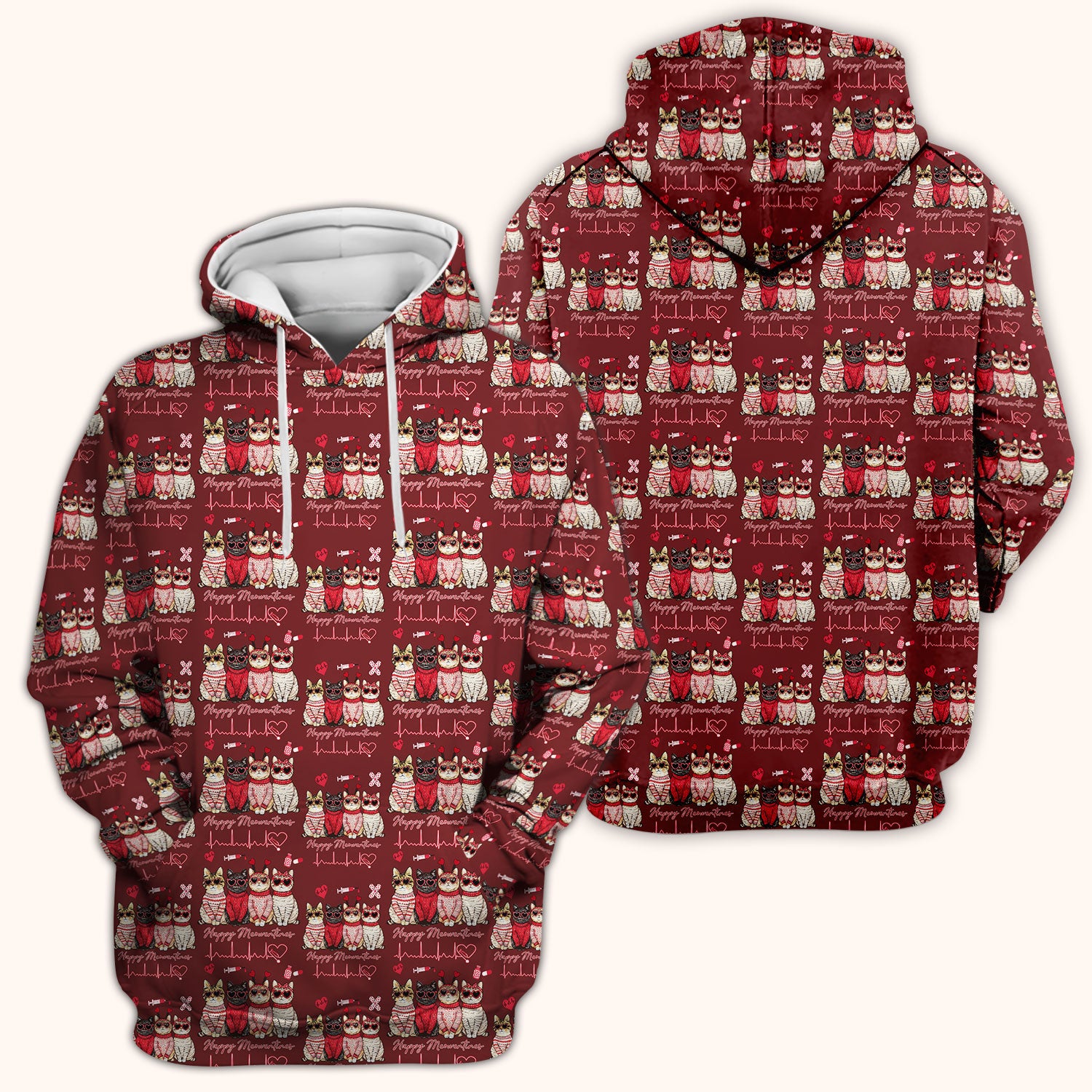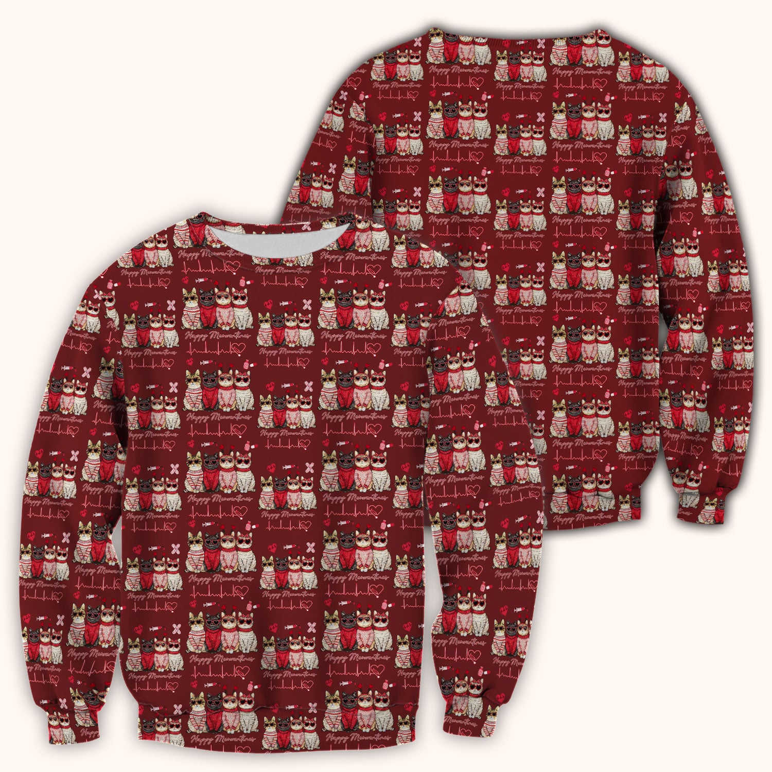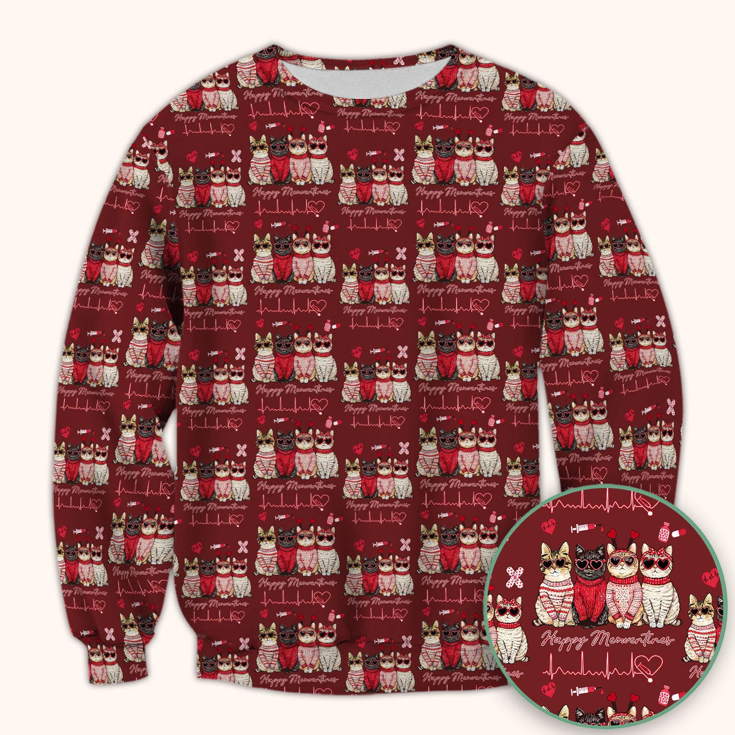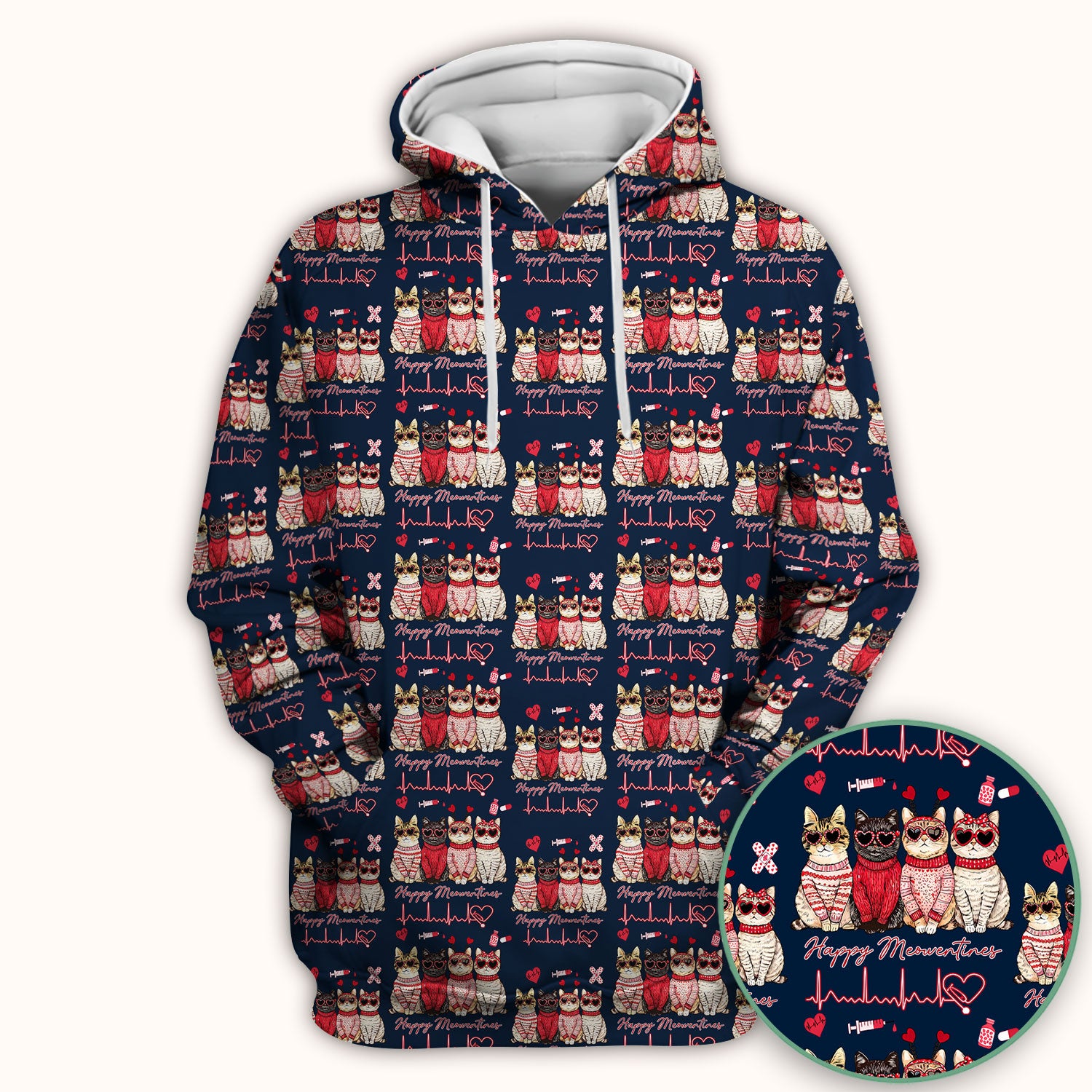 Happy Meowtines Cat Pattern Scrub Top, Valentine Cat Lover Nurse Scrub Shirt, Heartbeat Medical Pattern Nursing Uniform