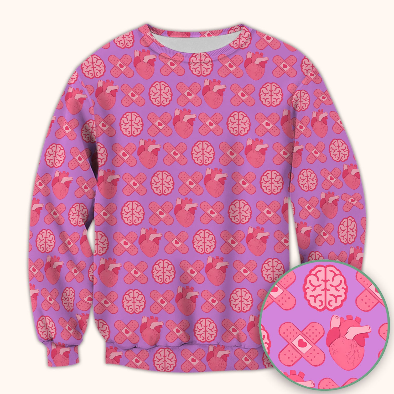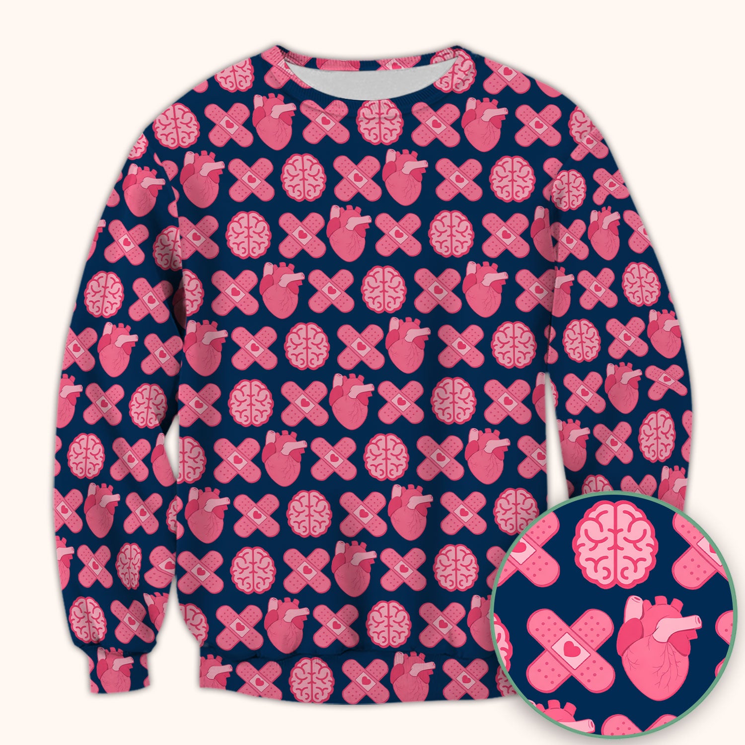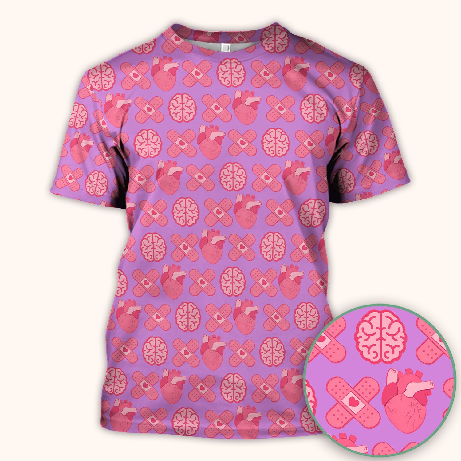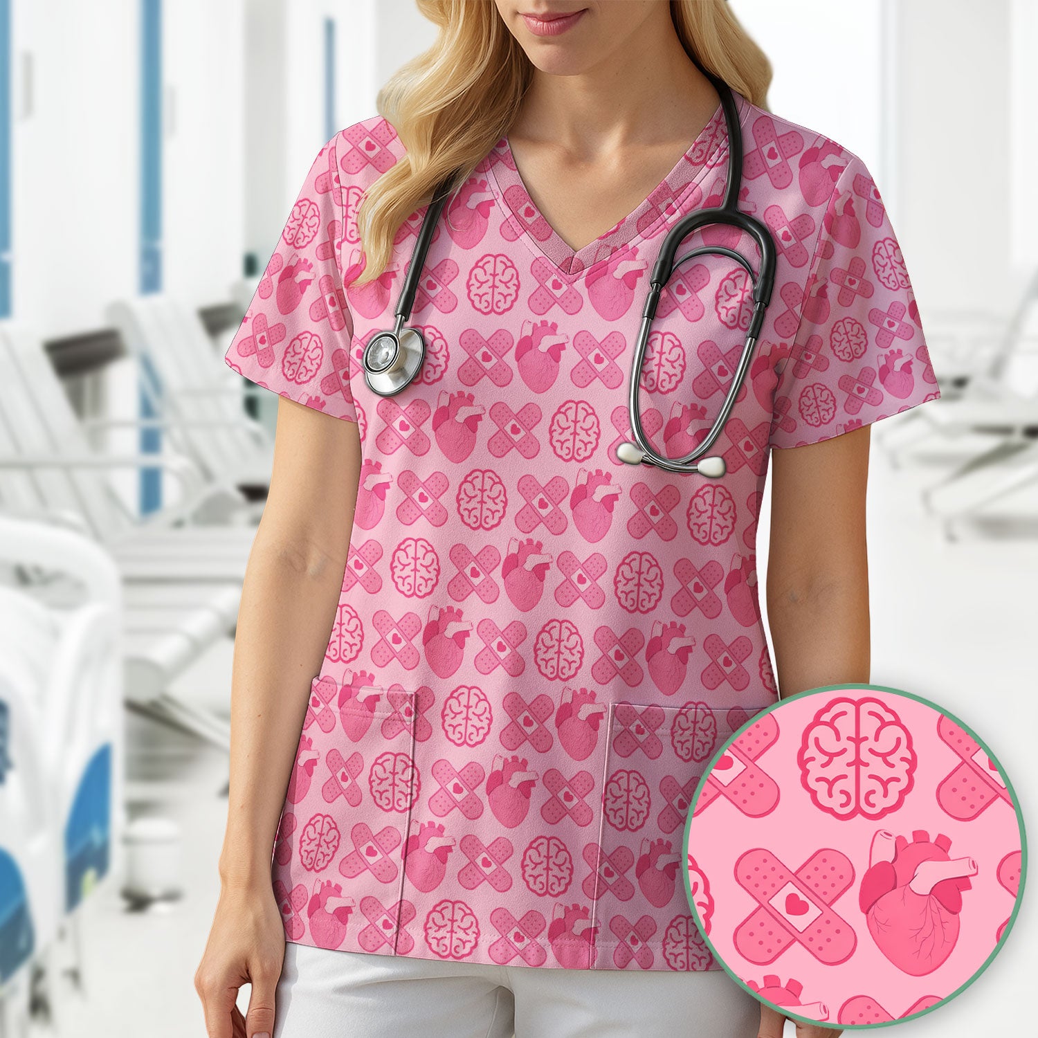 Heart & Brain Medical Icon Pattern Scrub Top, Breathable Fabrics Nursing Uniform