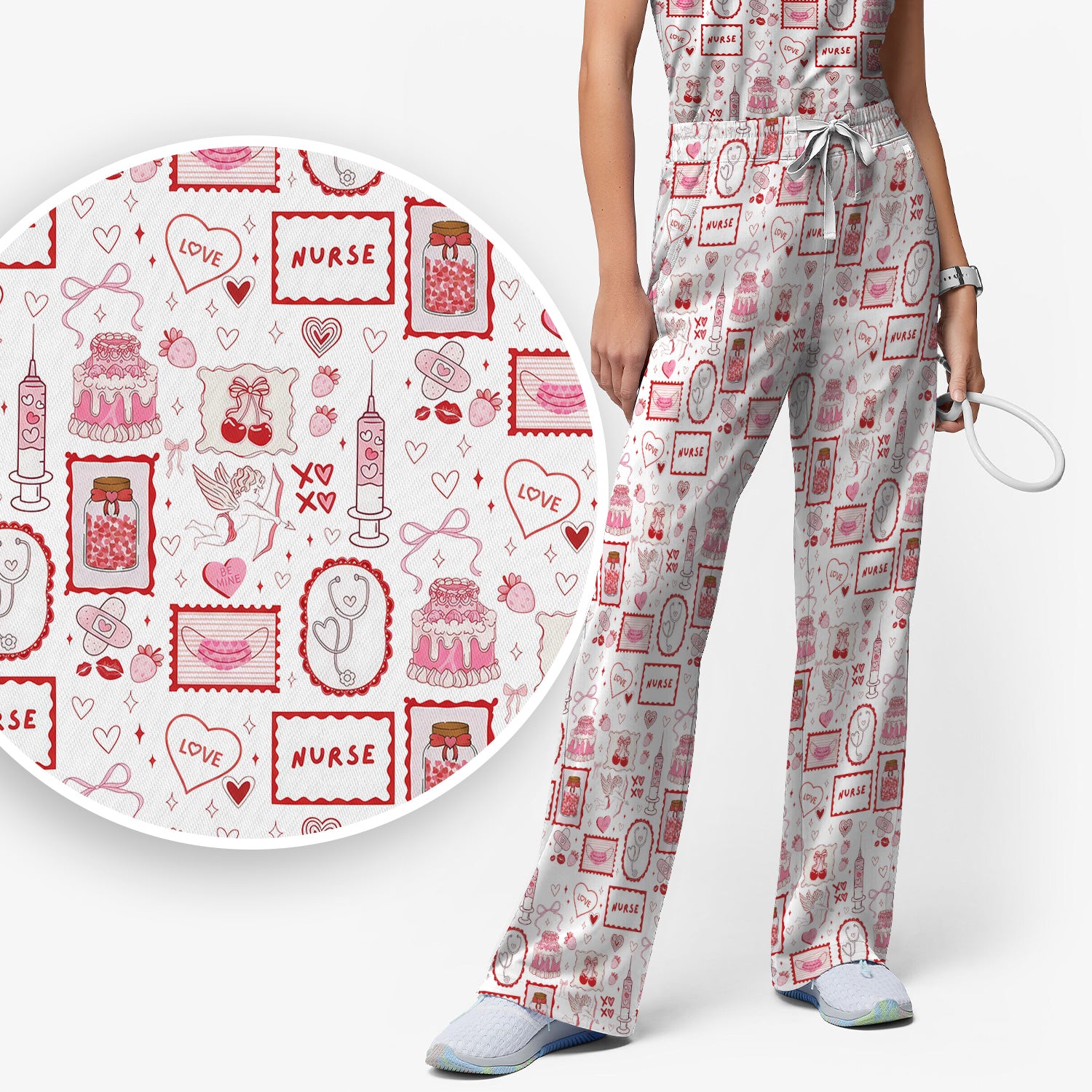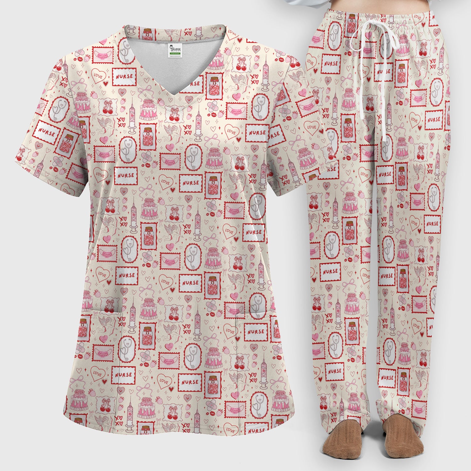 Nurse Icons Hearts Syringes Valentine Scrub Set, Scrub Pants and V Neck Top