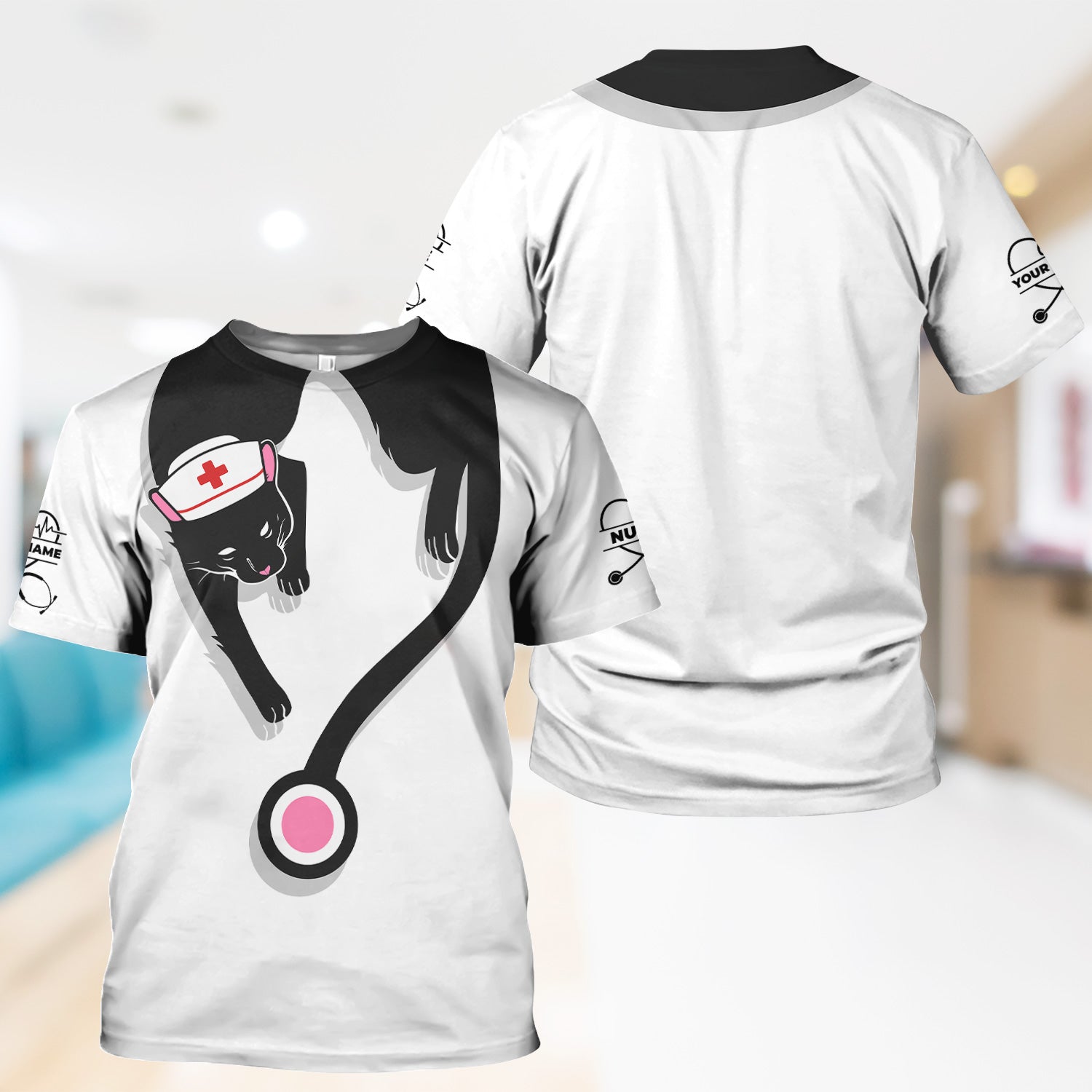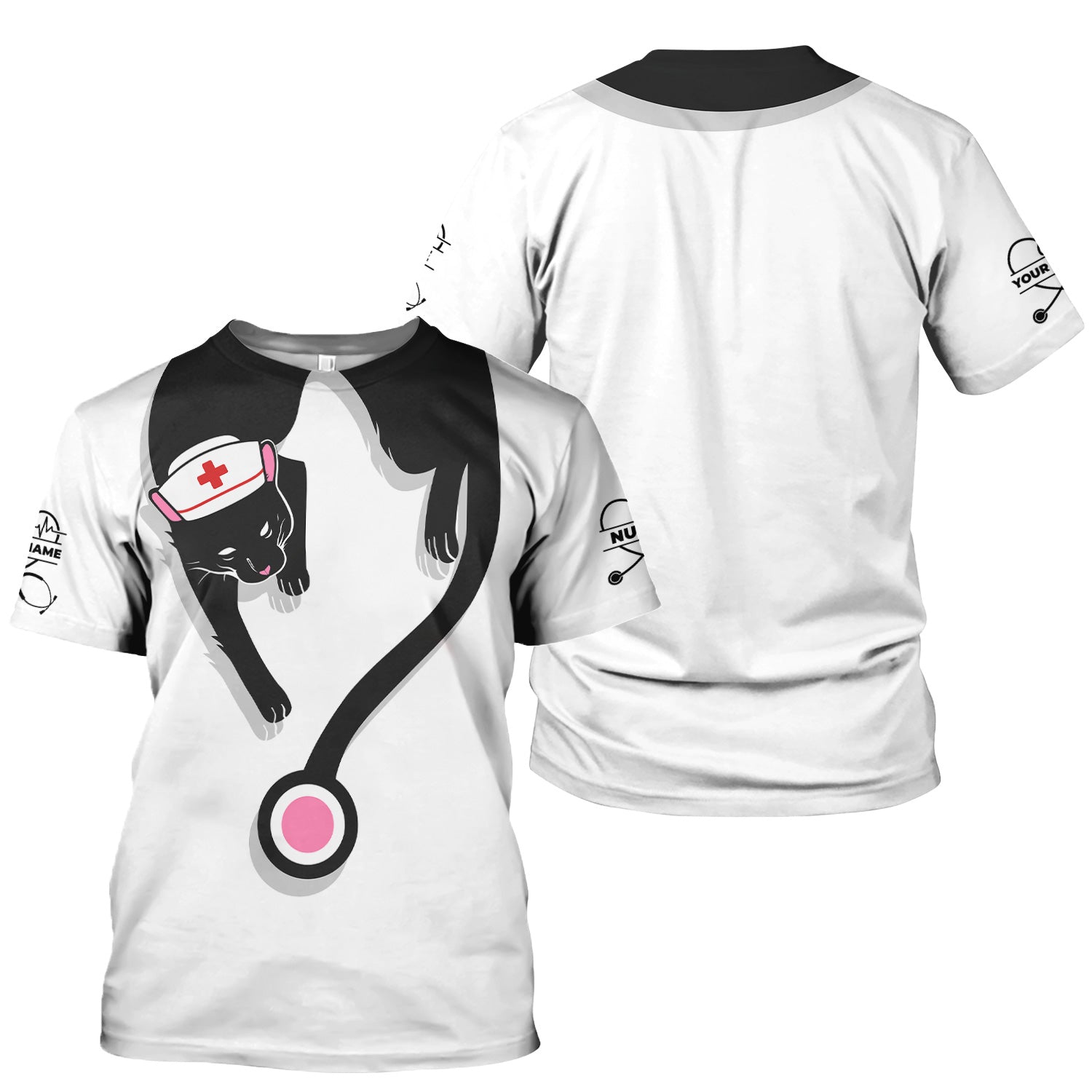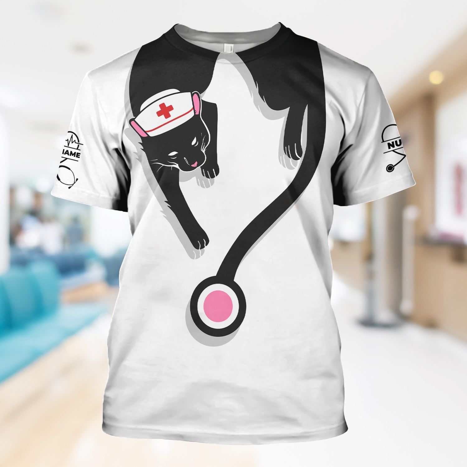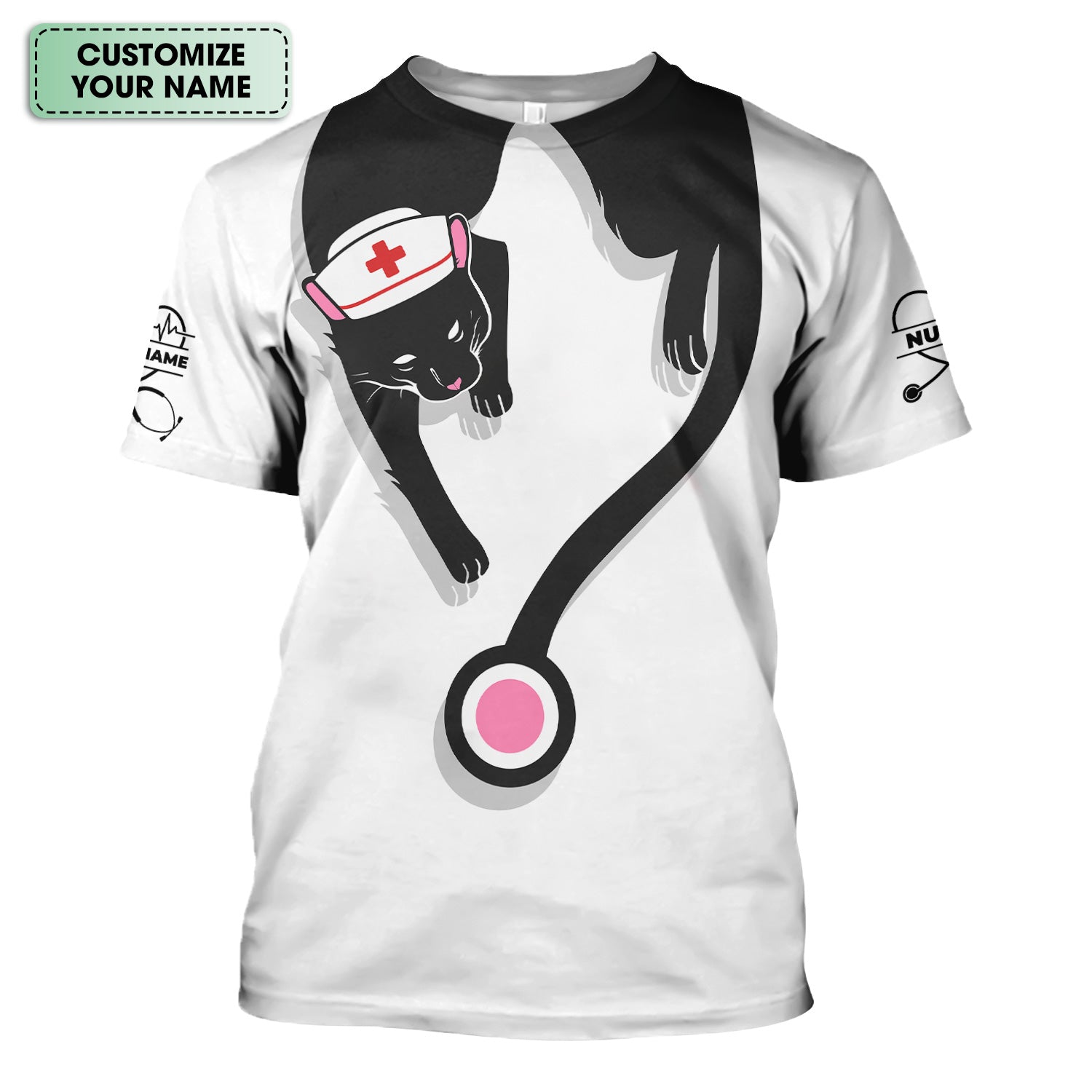 Personalized Black Cat Nurse Shirt - Funny Cat Lover Medical Tee for Women - Gift for RN LPN CNA