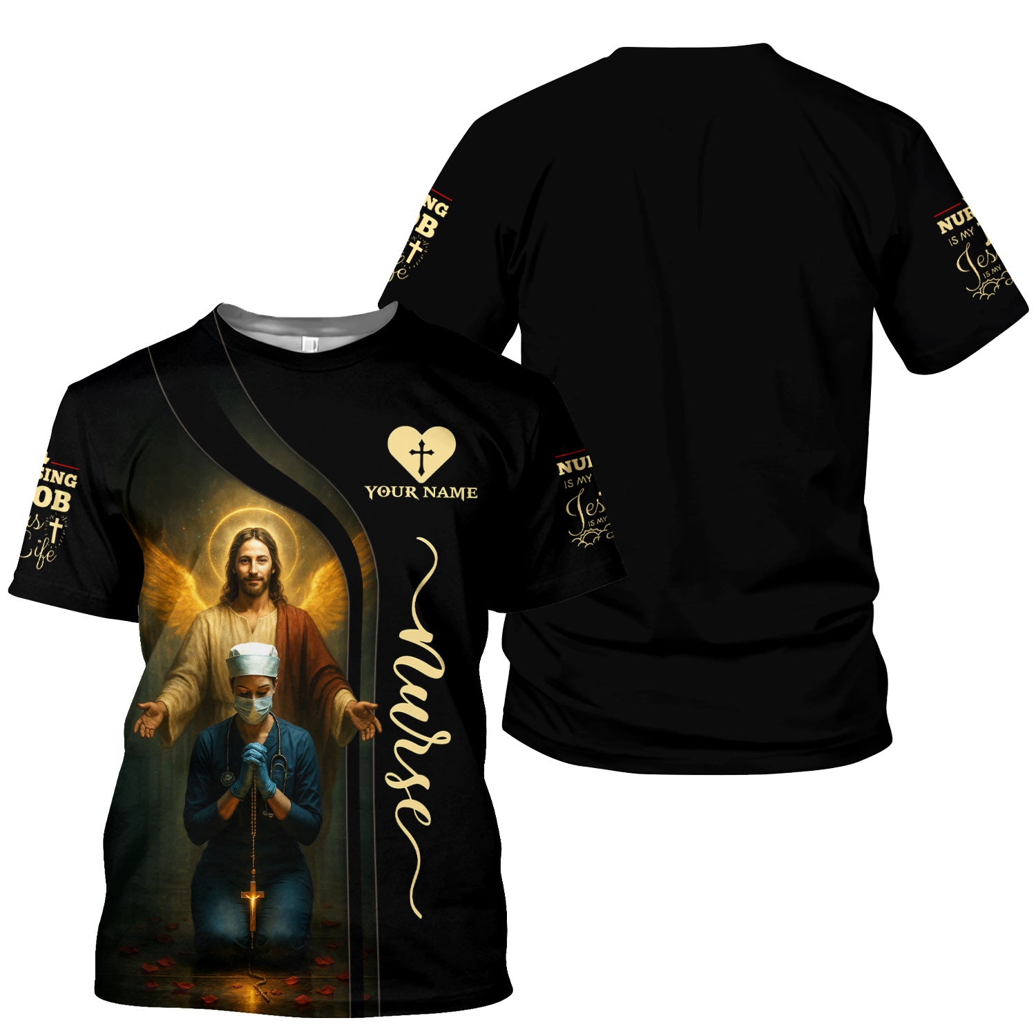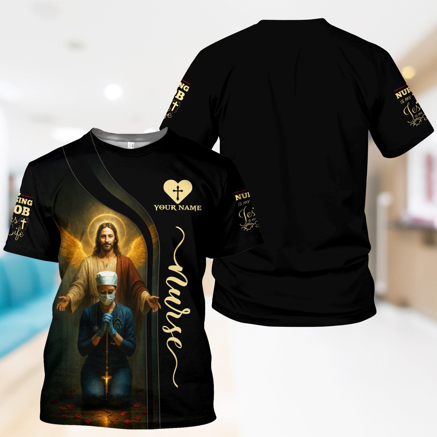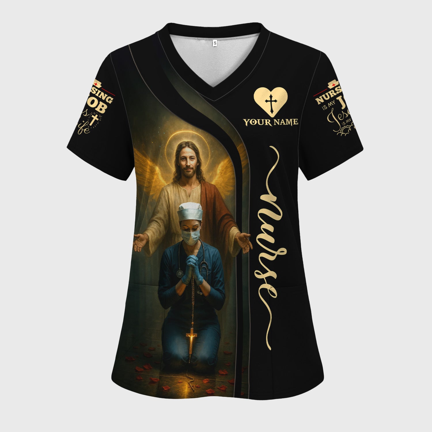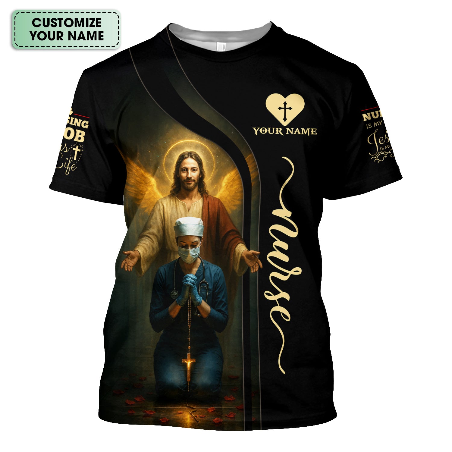 Personalized Christian Nurse Shirt - Jesus and Praying Nurse with Rosary Design - RN LPN CNA Healthcare Workers Gift