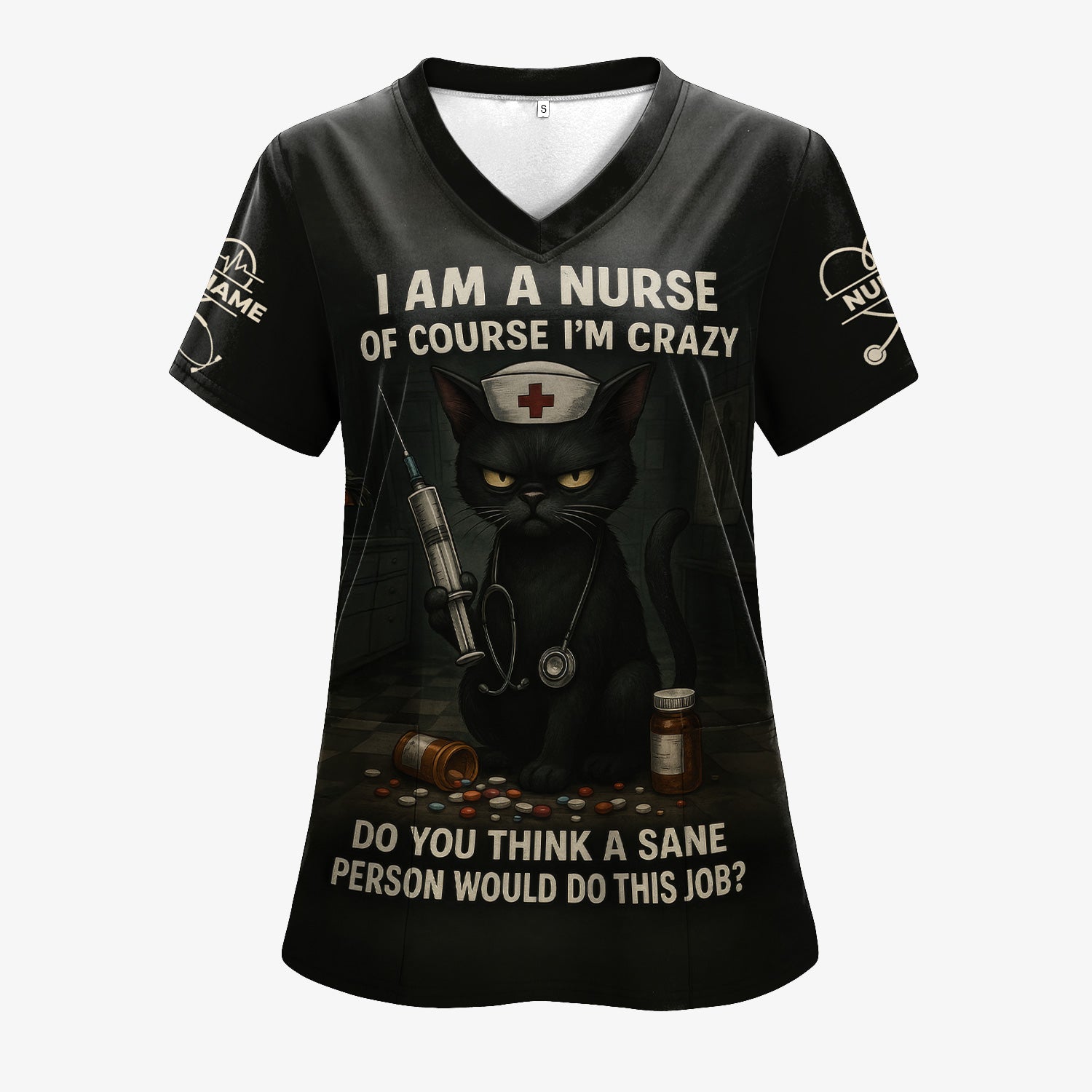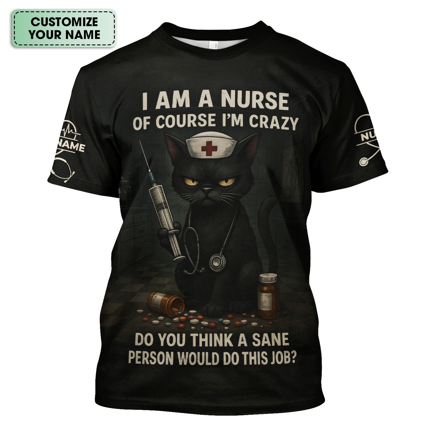 Personalized Crazy Nurse Graphic Shirt - Black Cat with Quote for RN, LPN, CNA - Hilarious Gift for Night Shift Nurses