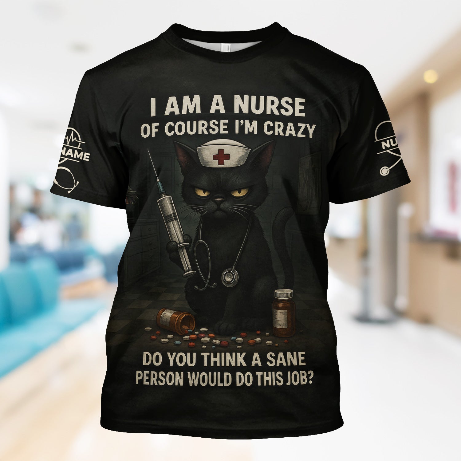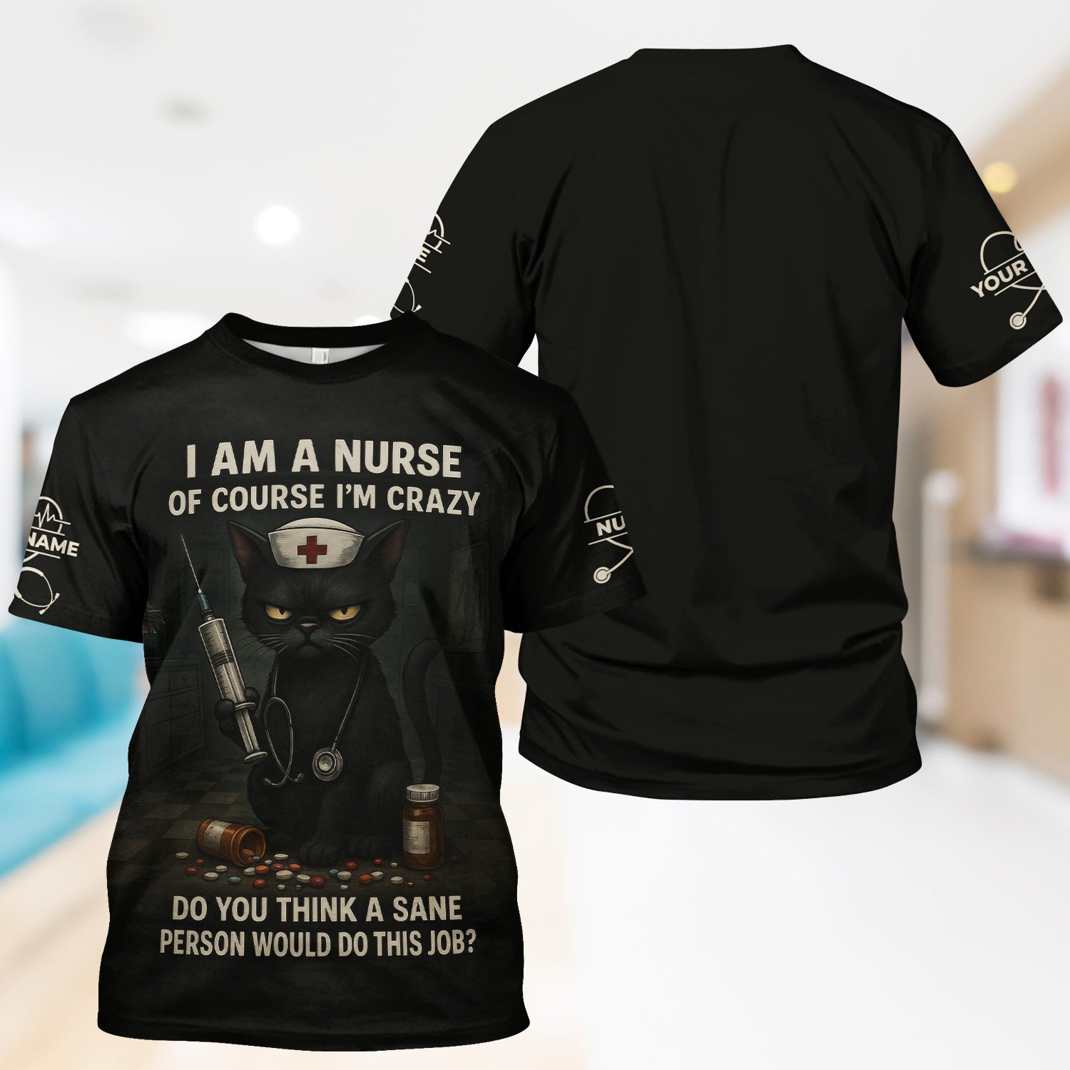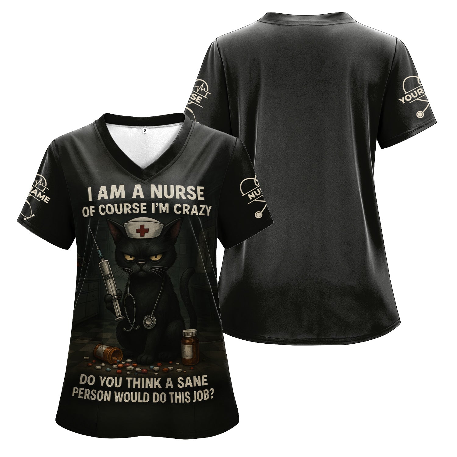 Personalized Dark Humor Nurse Scrub Shirt - I Am a Nurse of Course I'm Crazy - Funny Black Cat Gift for RN CNA LPN