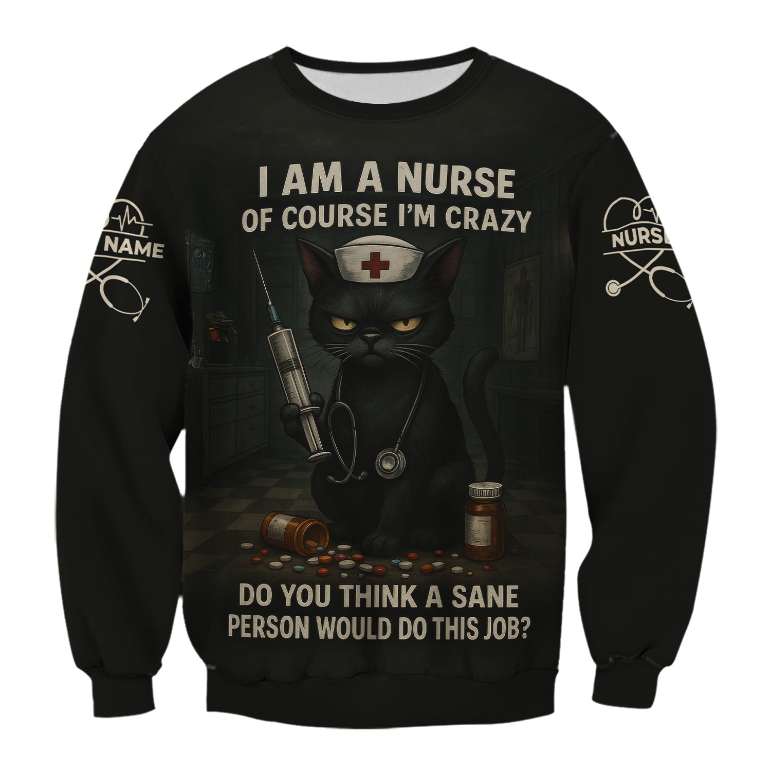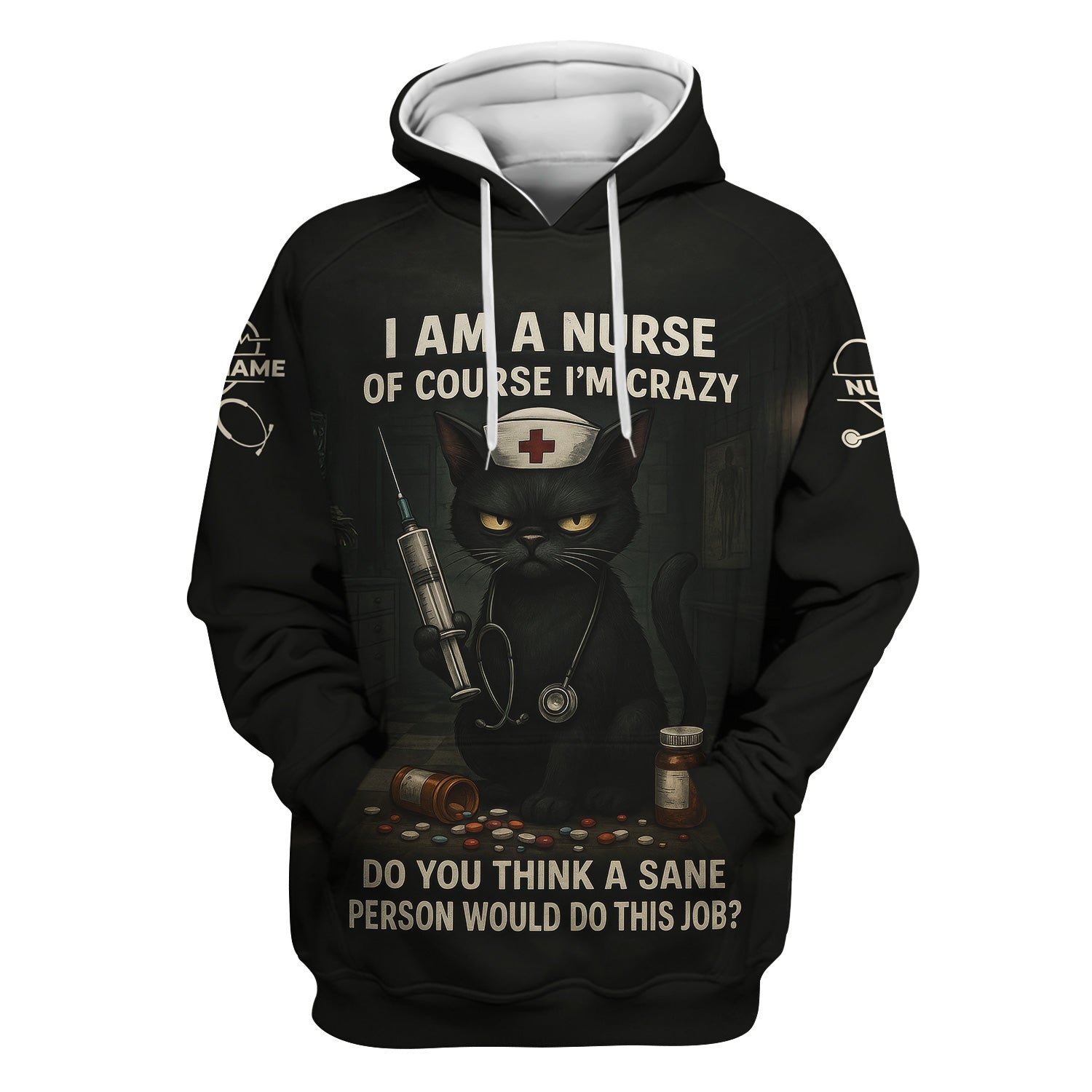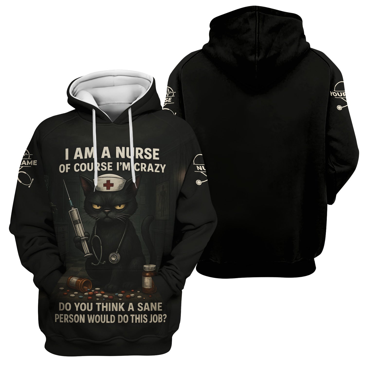 Personalized Dark Humor Nurse Scrub Shirt - I Am a Nurse of Course I'm Crazy - Funny Black Cat Gift for RN CNA LPN
