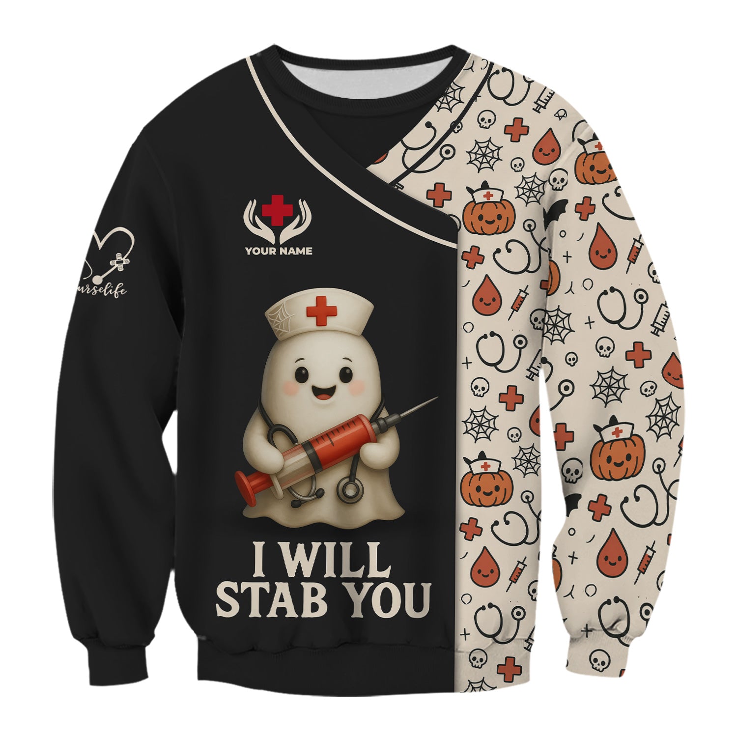 Personalized Funny Halloween Nurse Scrub Top - I Will Stab You Ghost with Syringe for Women RN LPN CNA - Gift for Healthcare Worker