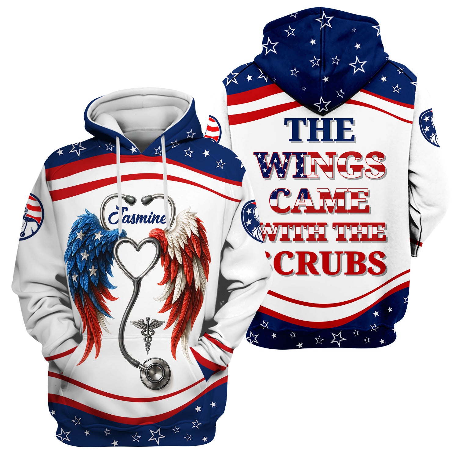Personalized Nurse Shirt - American Flag Angel Wings & Scrubs Design - Patriotic Gift for RN LPN CNA Women