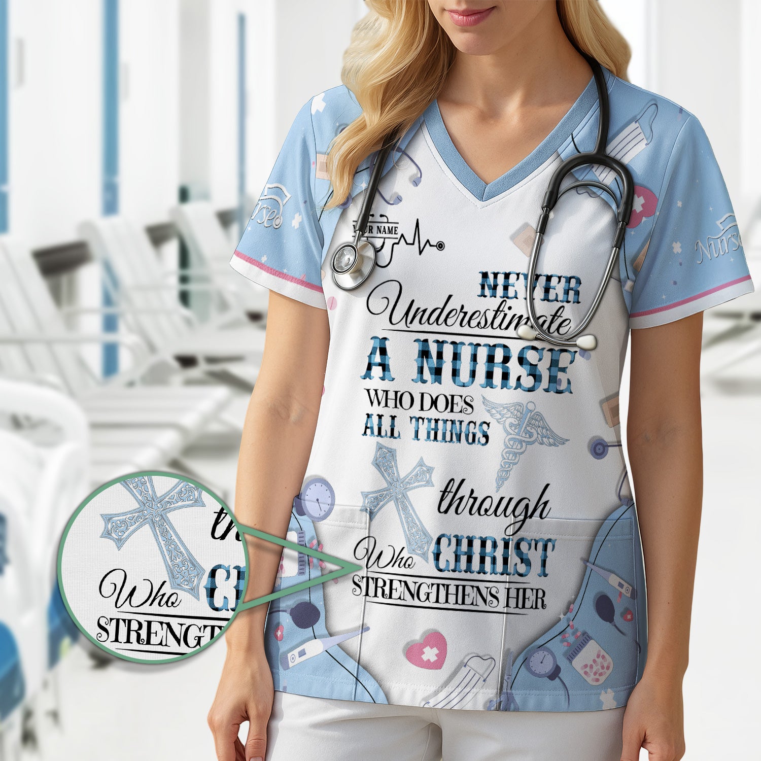 Personalized Nursing Faith Scrub for Women - Bible Verse All Things Through Christ - Religious Gift for Healthcare Professionals RN LPN CNA