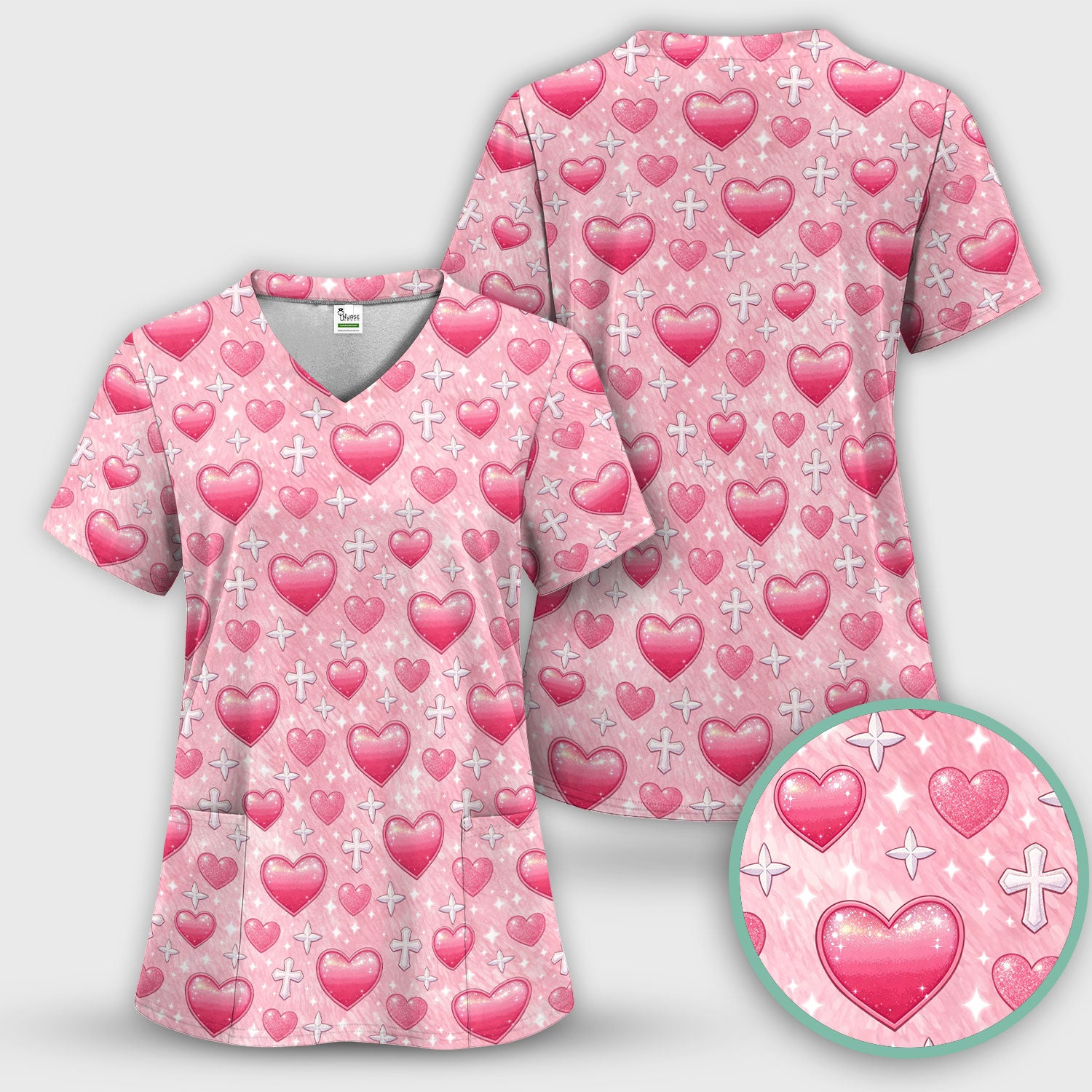 Pink Heart & Cross Pattern Scrub Top, Comfortable Scrubs for Nurses Uniform, Valentine's Day gift