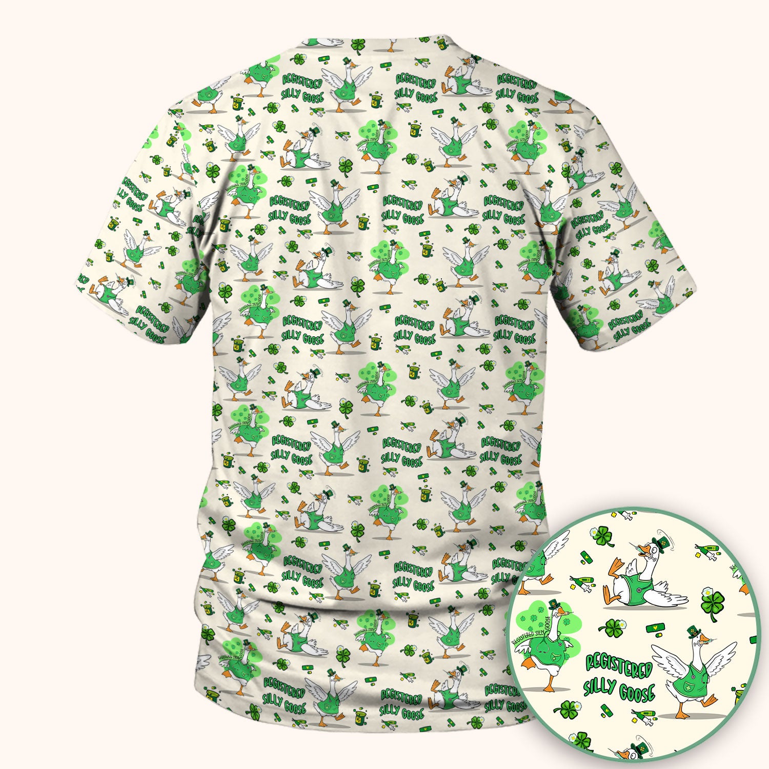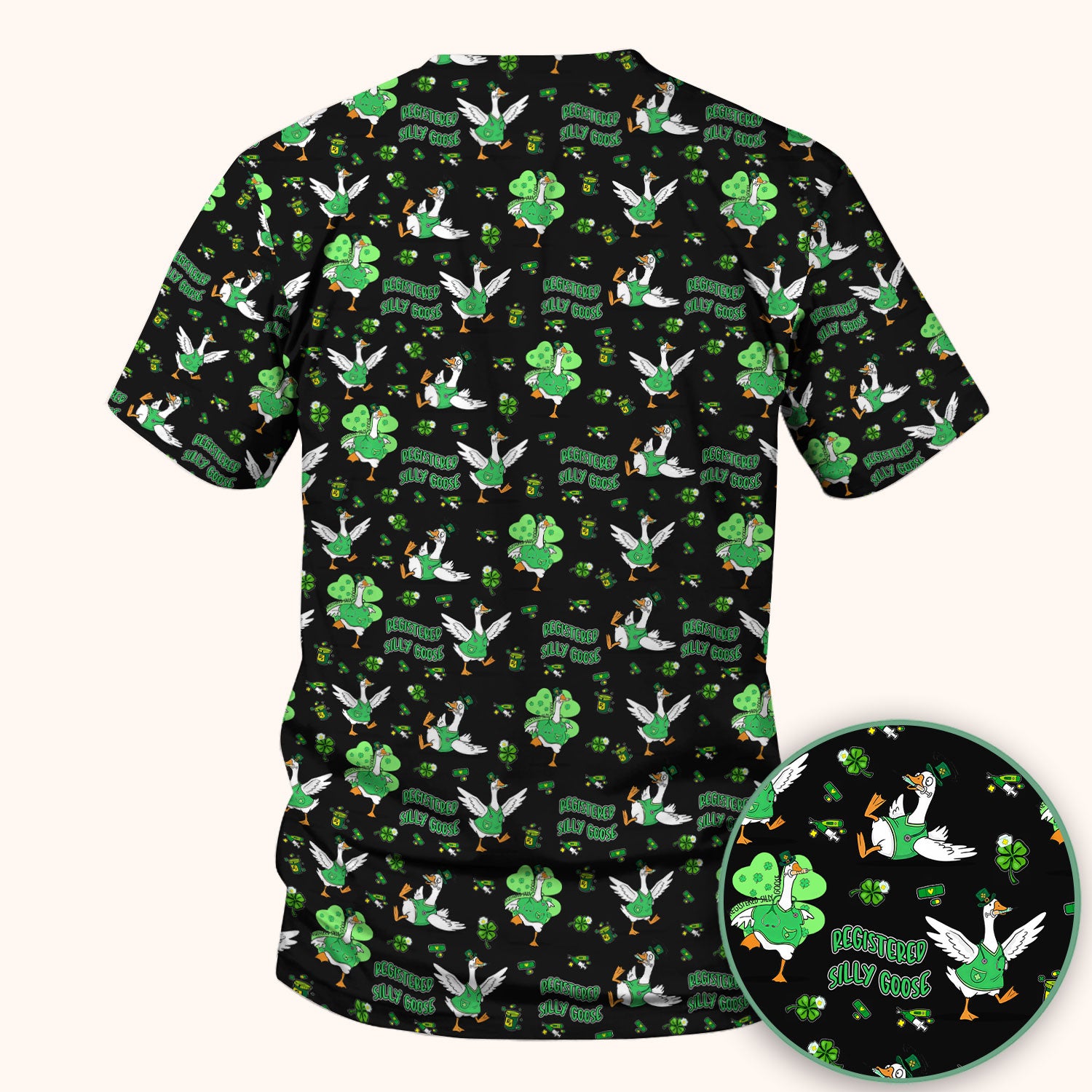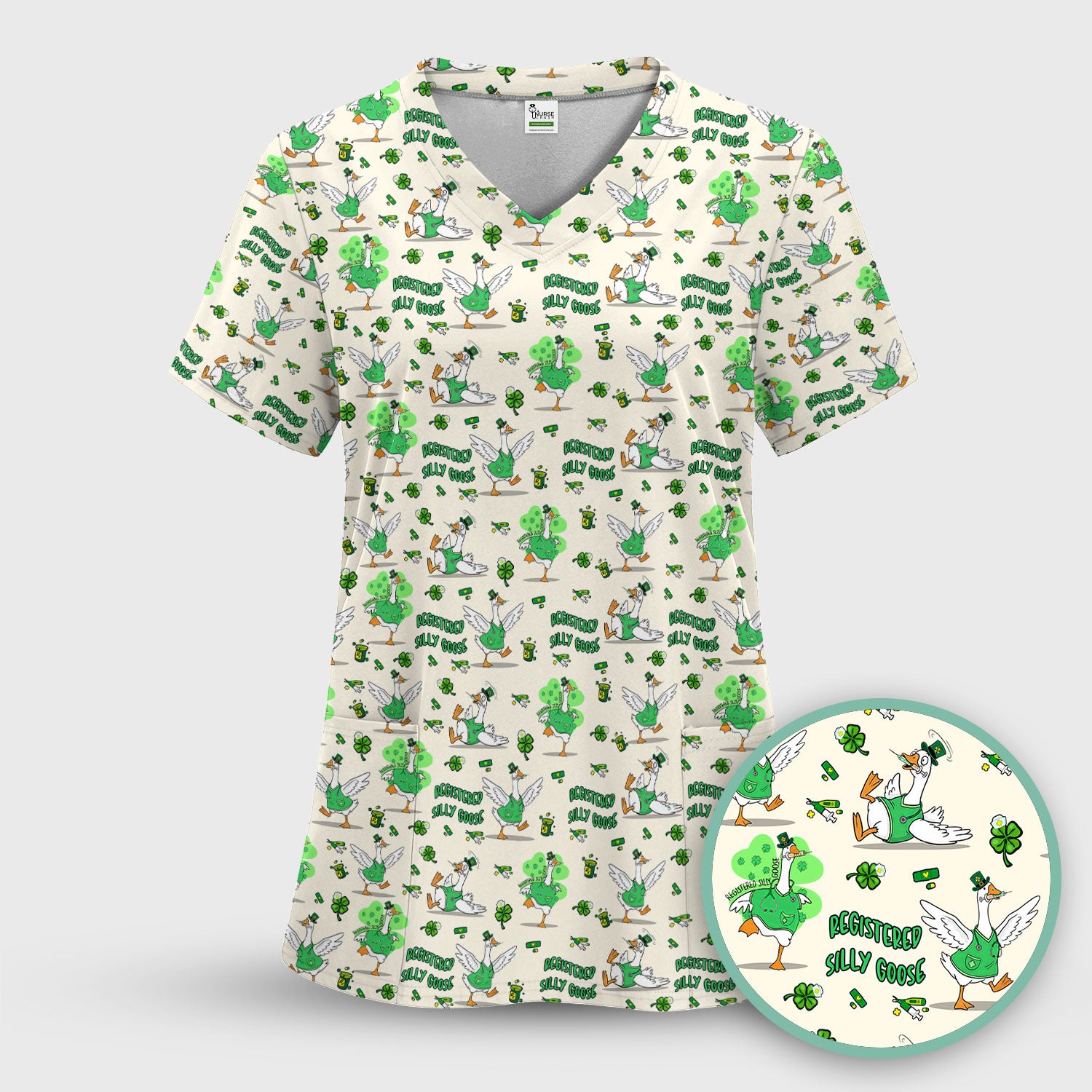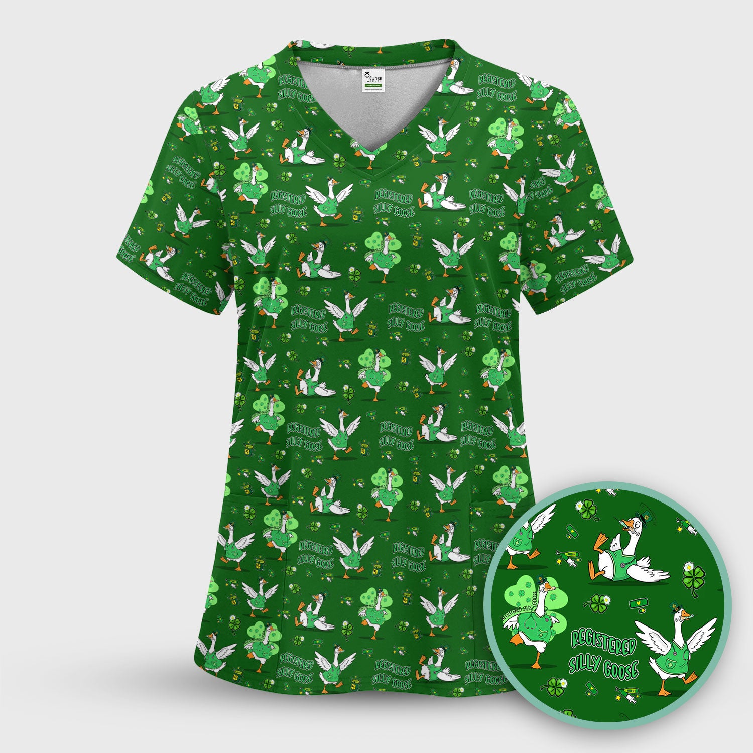 Silly Goose St. Patrick’s Day Scrub Top, Funny Goose Shamrock Pattern Nurse Scrub Shirt, Irish Green Nursing Uniform