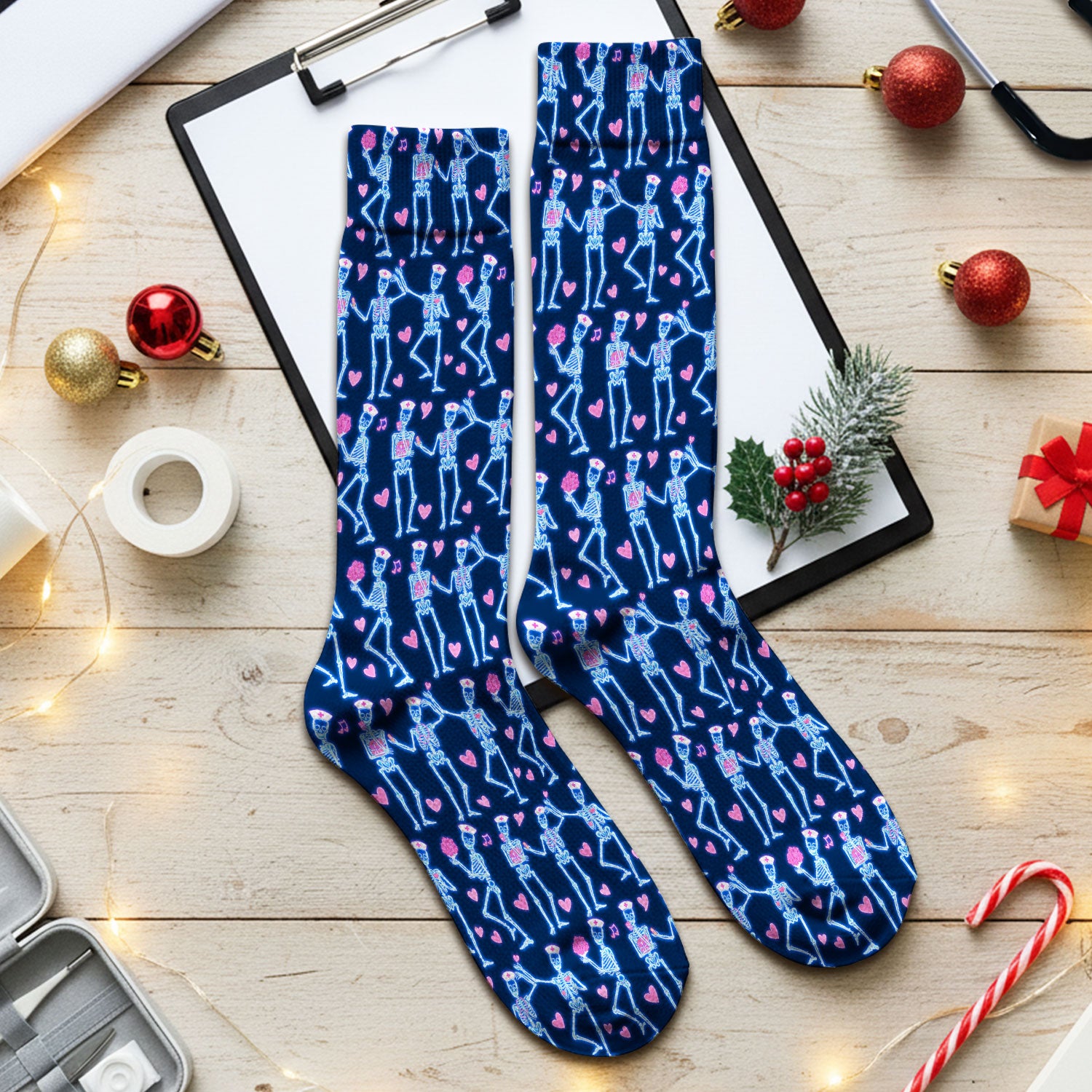 Skeleton Nurse Heart Pattern Socks, Playful Nurse Style, Adult Socks for Men and Women