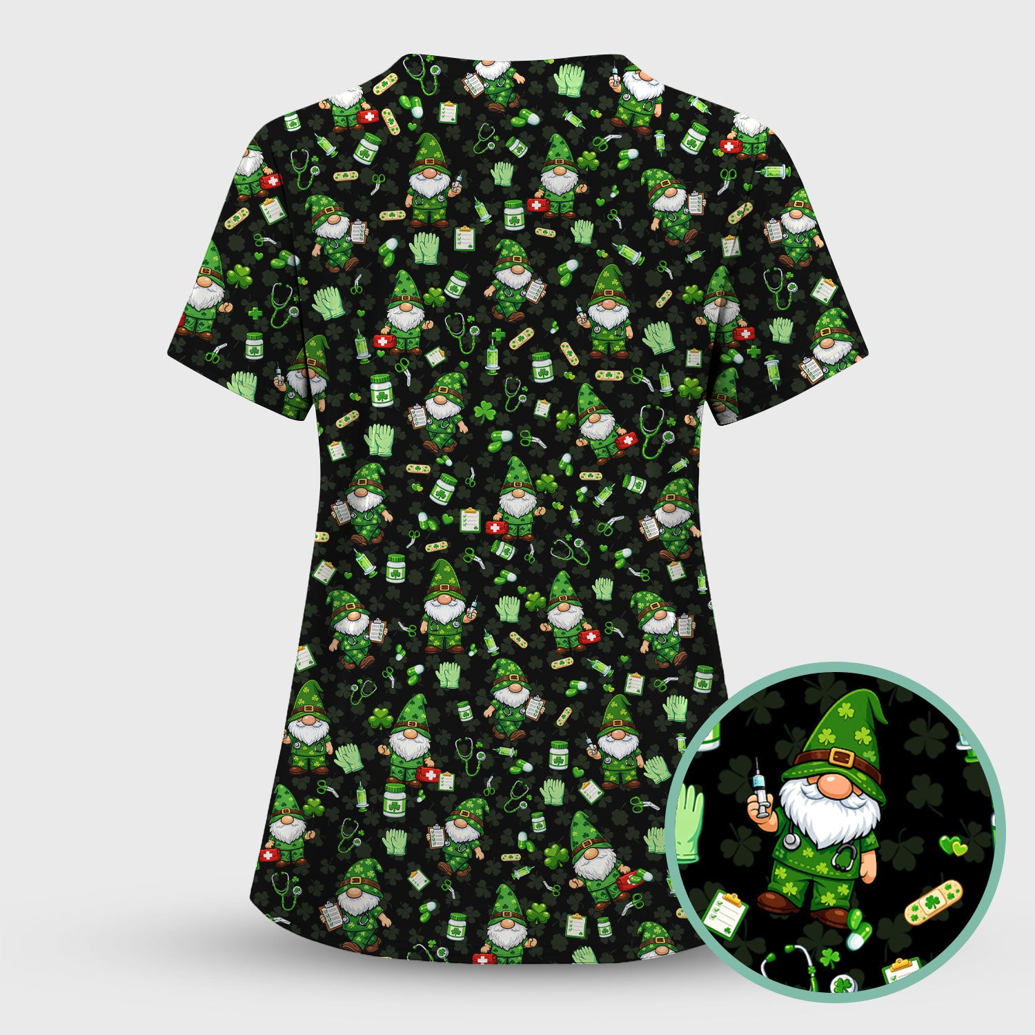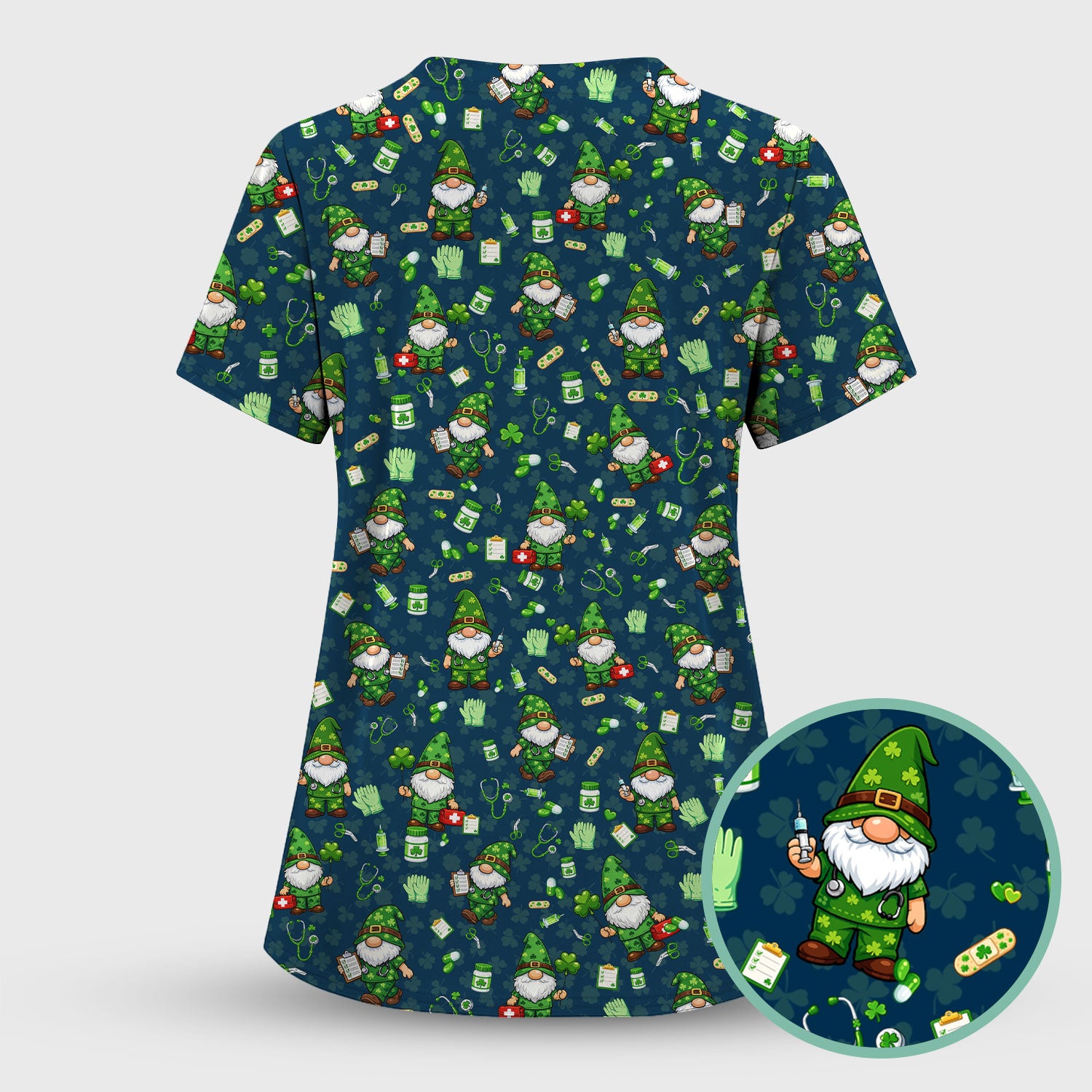 St. Patrick’s Day Nurse Gnome Scrub Top, Green Lucky Medical Pattern Nurse Shirt, Breathable Fabrics Nursing Uniform