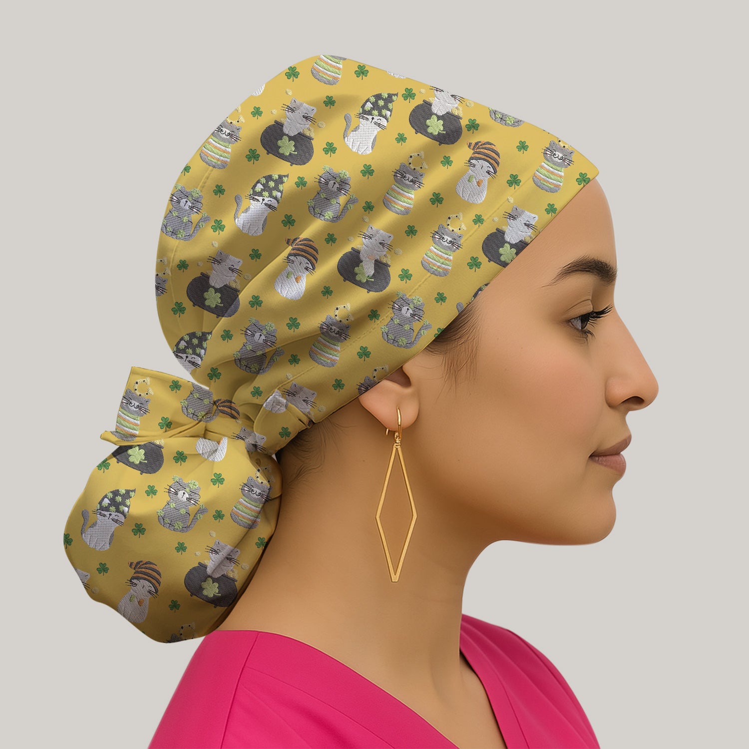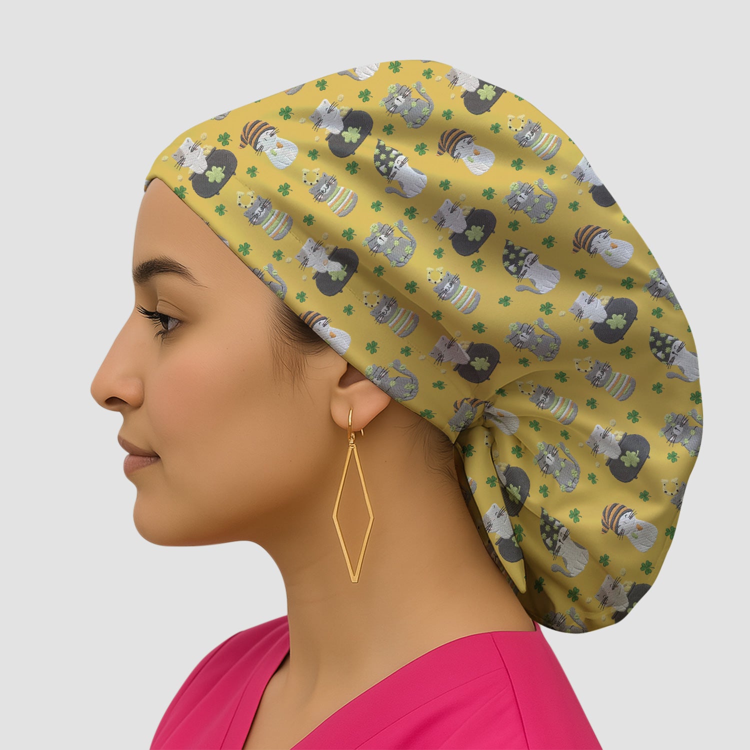 St. Patrick’s Day Scrub Cap, Lucky Cat With Shamrock Pattern Hat, Breathable Fabrics Nursing Uniform