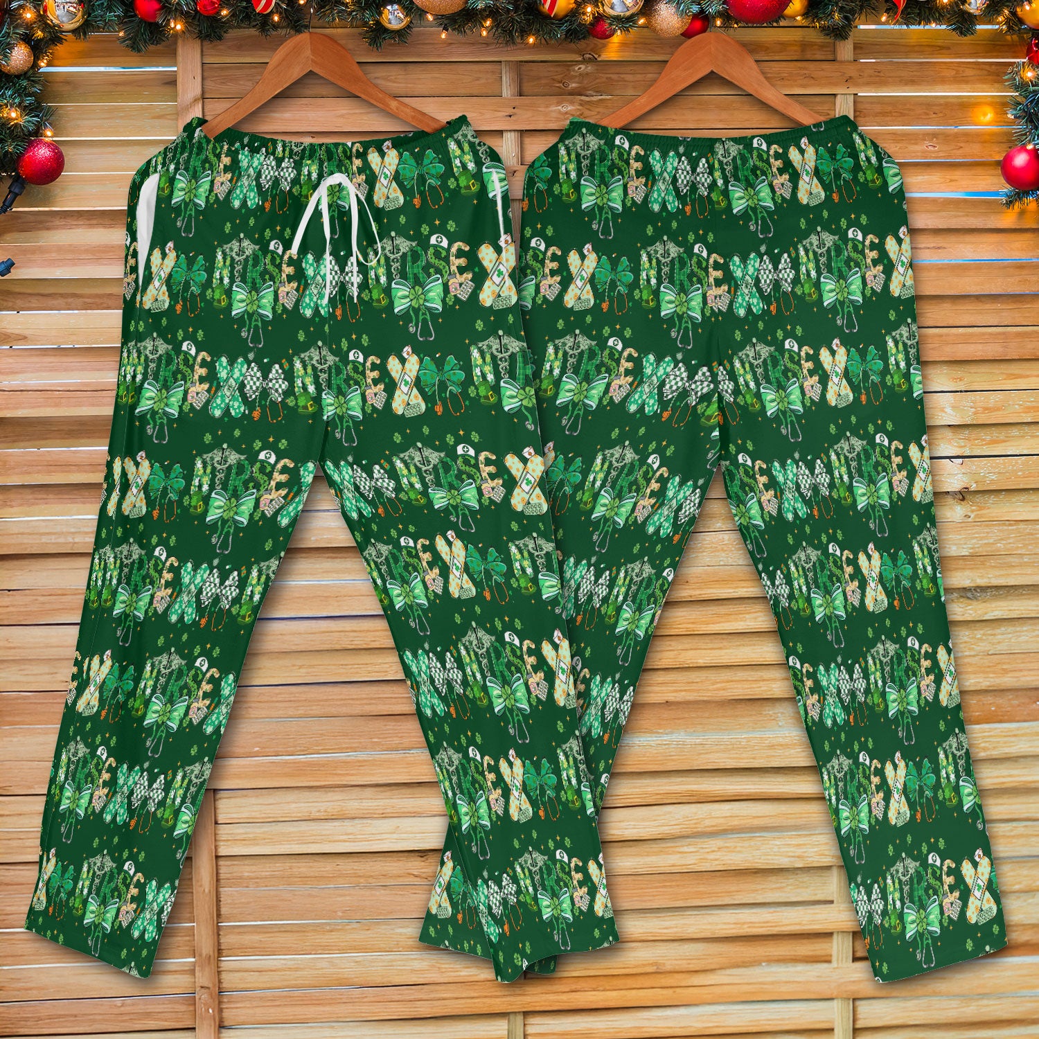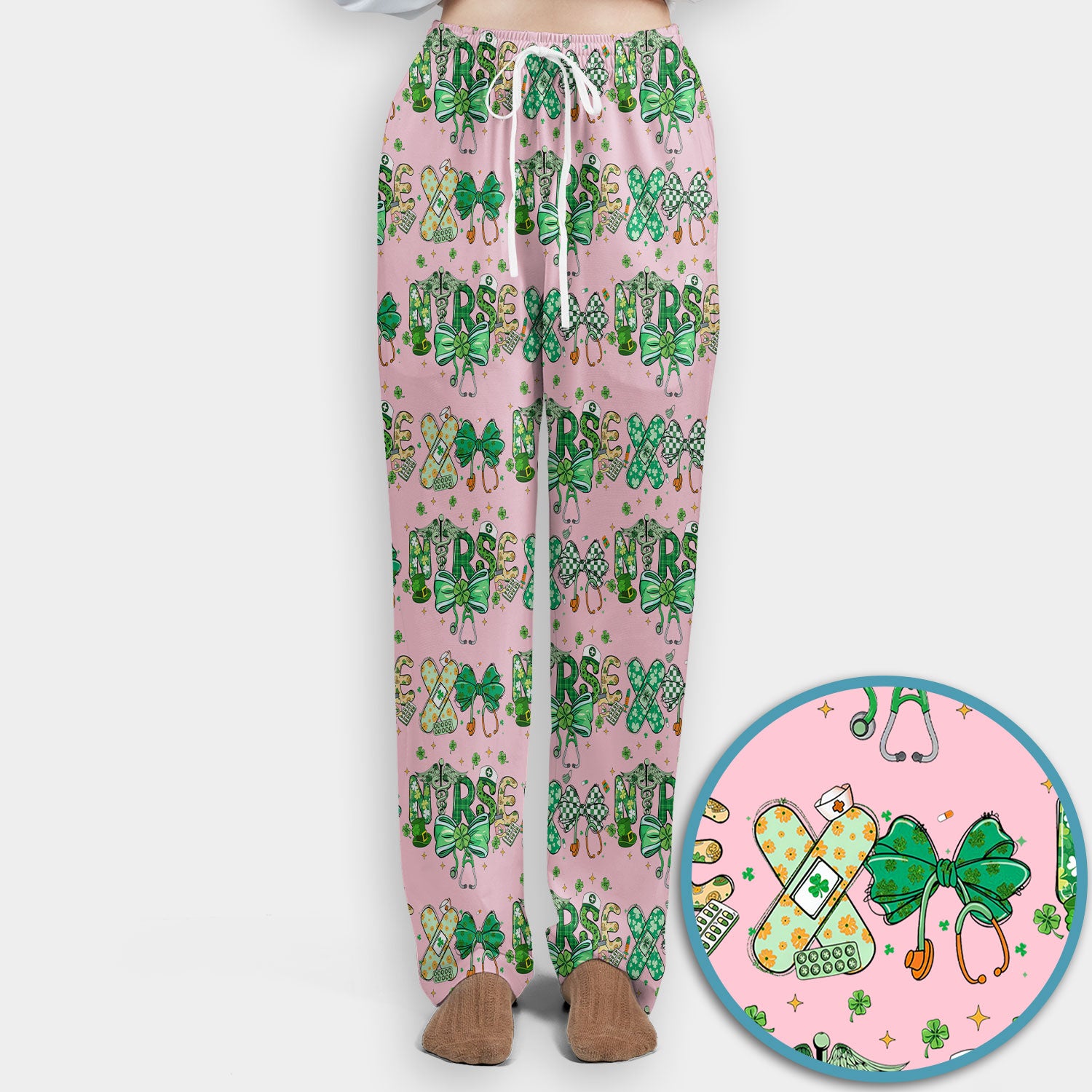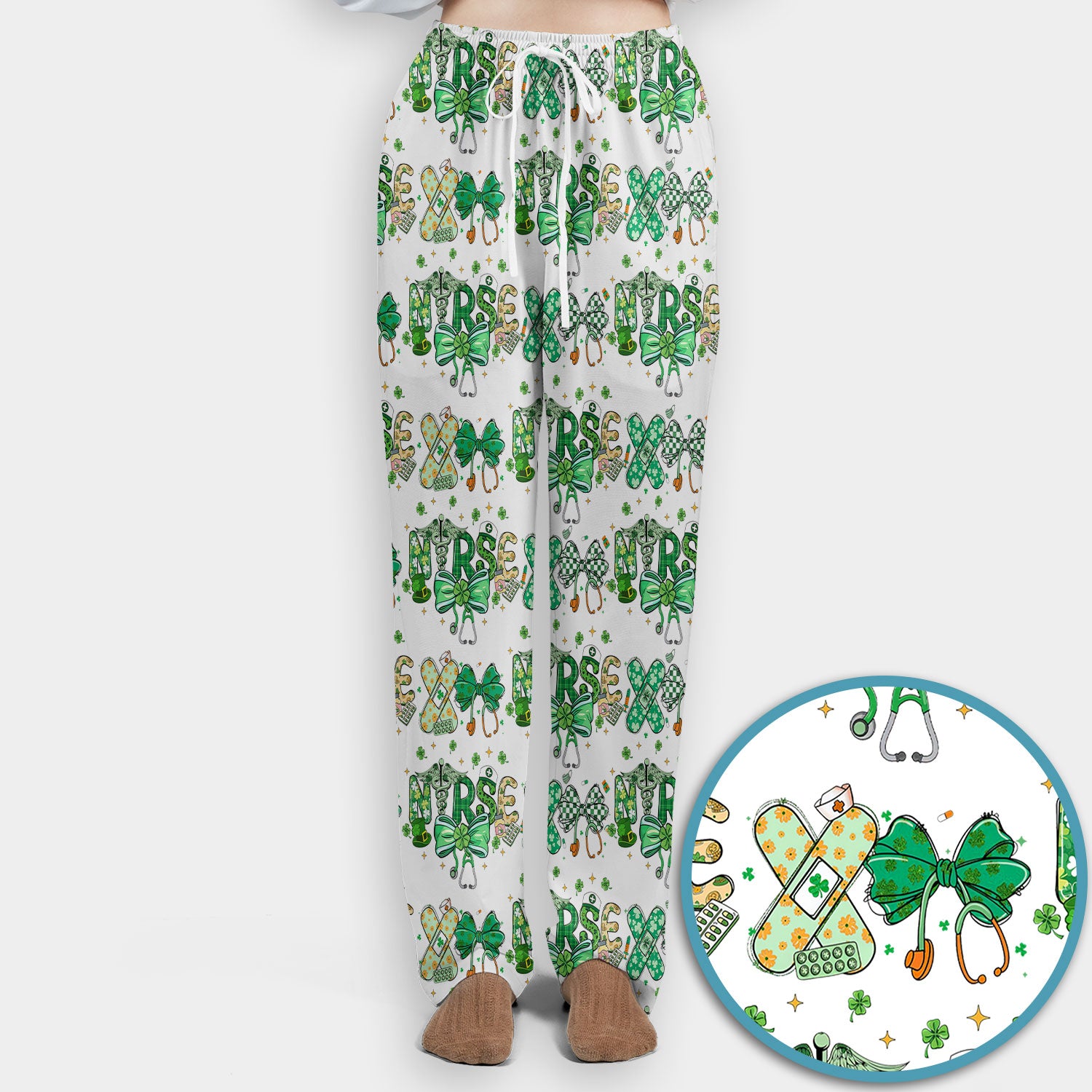 St. Patrick’s Nurse Scrub Set, Lucky Clover And Green Bow Pattern Nurse Shirt, Breathable Fabrics Nursing Uniform