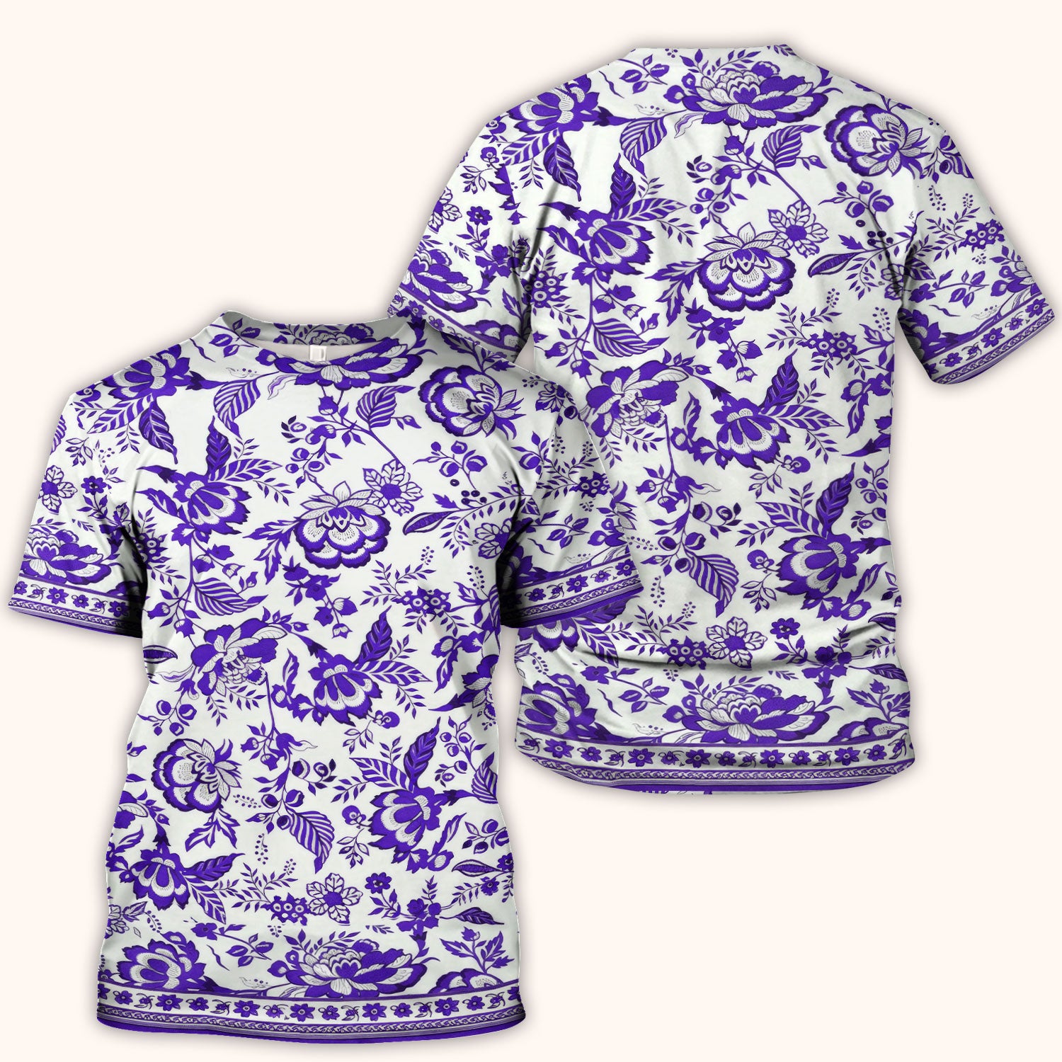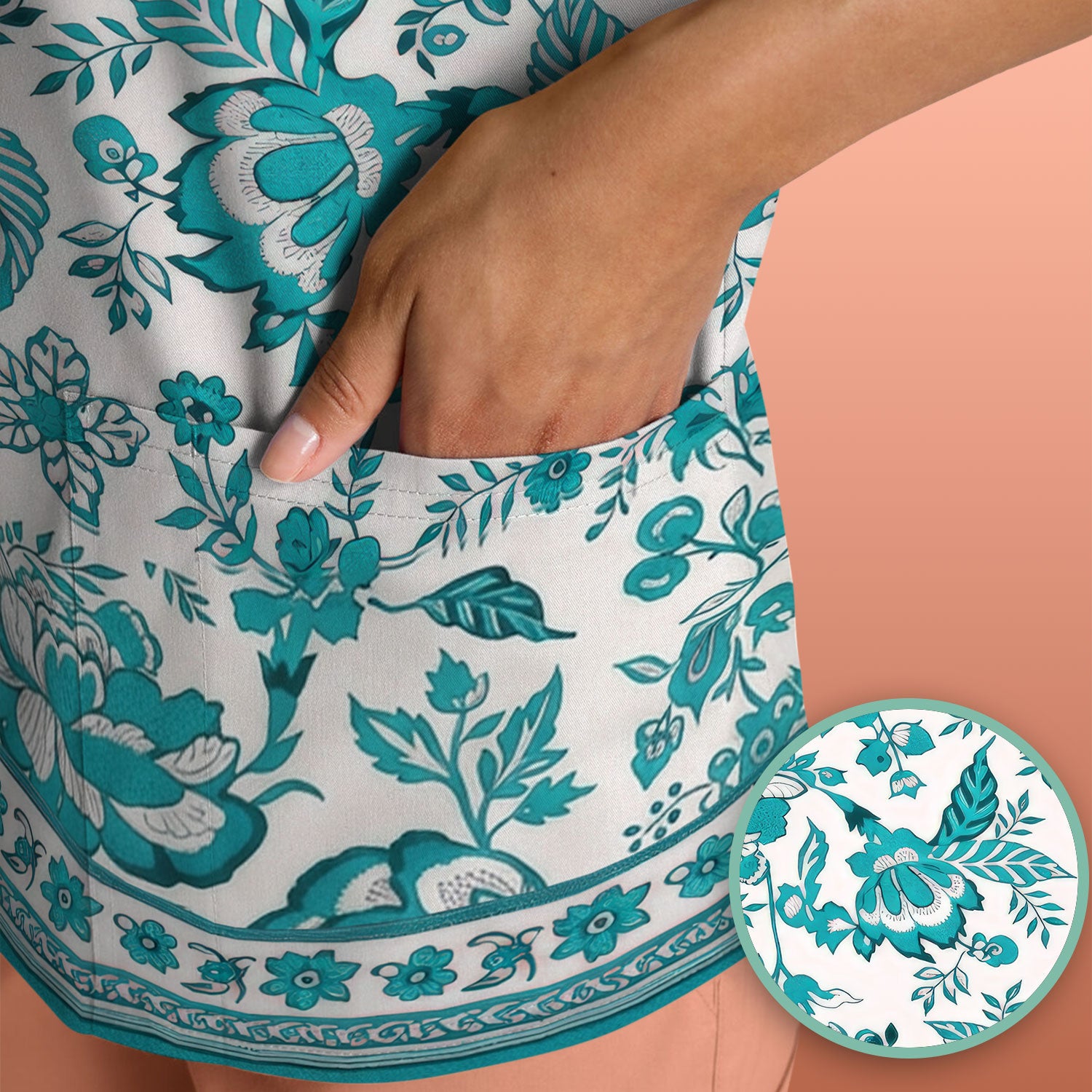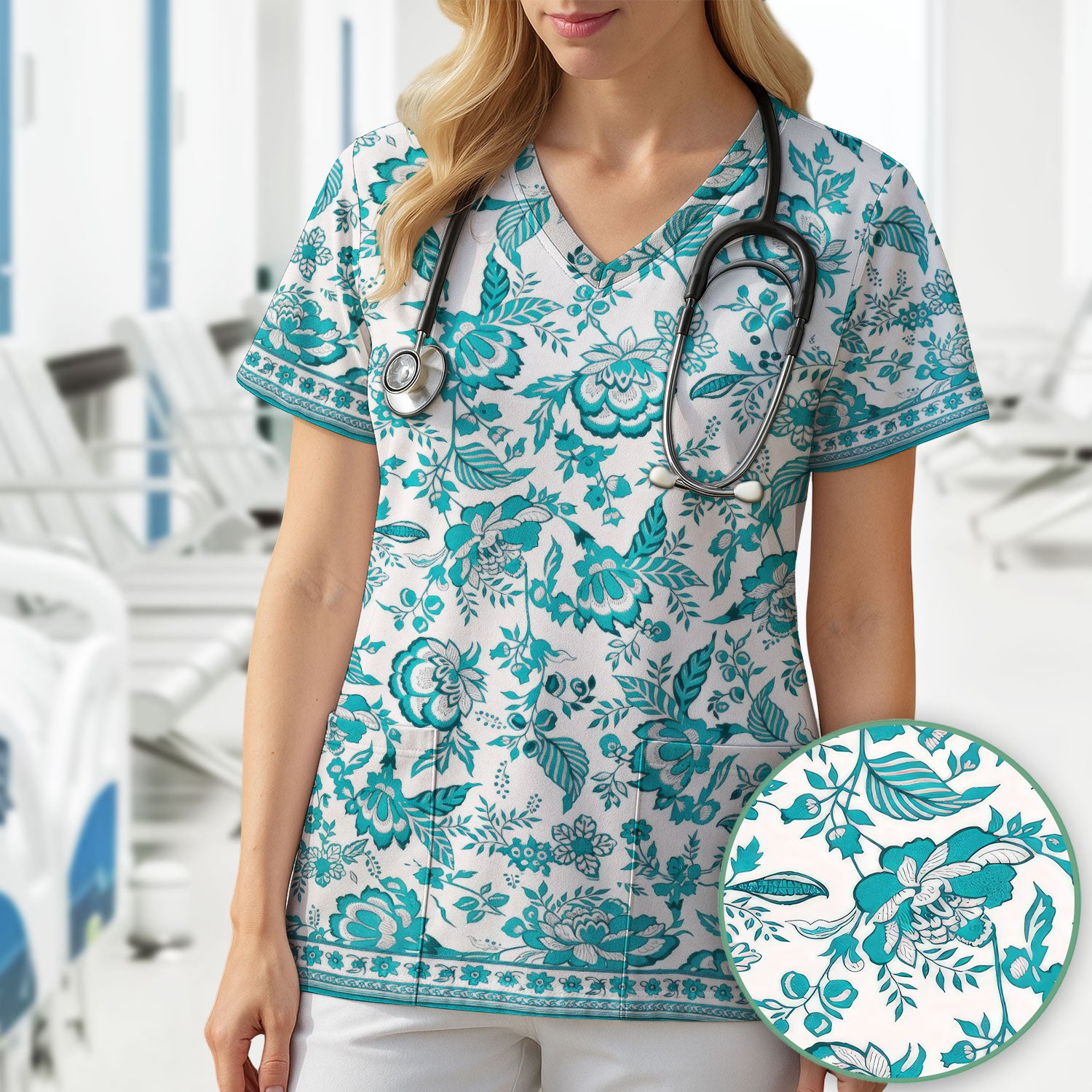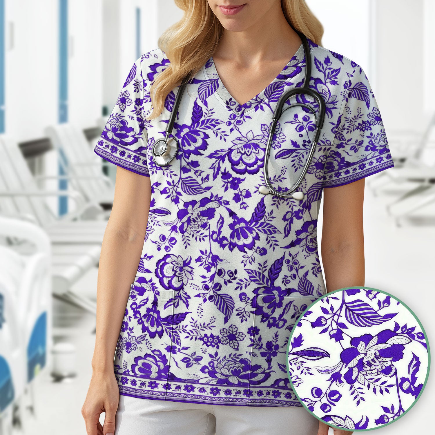 Toile De Jouy Scrub Top For Women, Floral Pattern Nurse Shirt, Comfortable Scrubs For Nursing