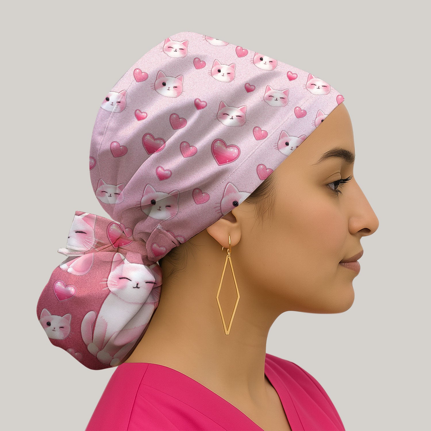 Valentine Cat Scrub Cap, Cute Heart Pattern Nurse Hat, Comfortable Scrubs For Nursing