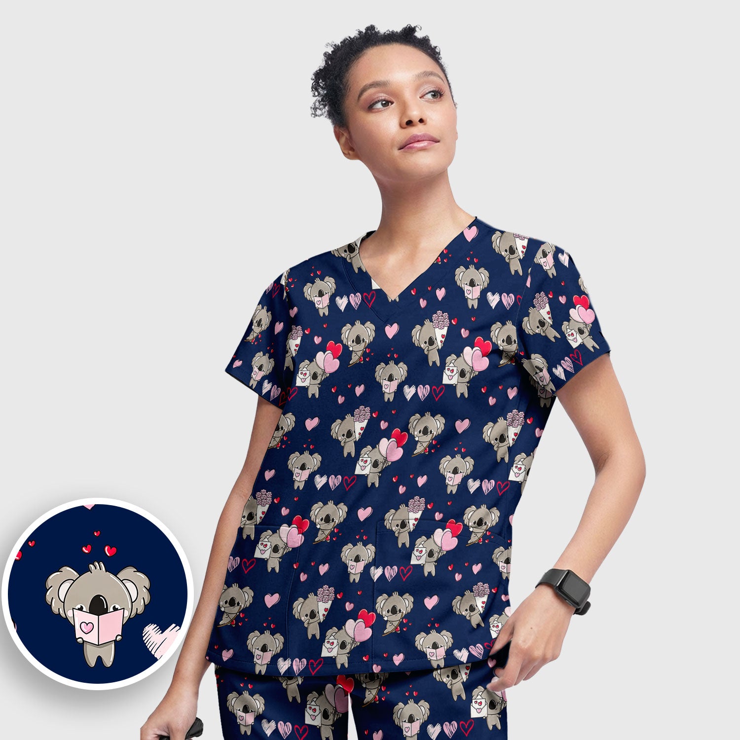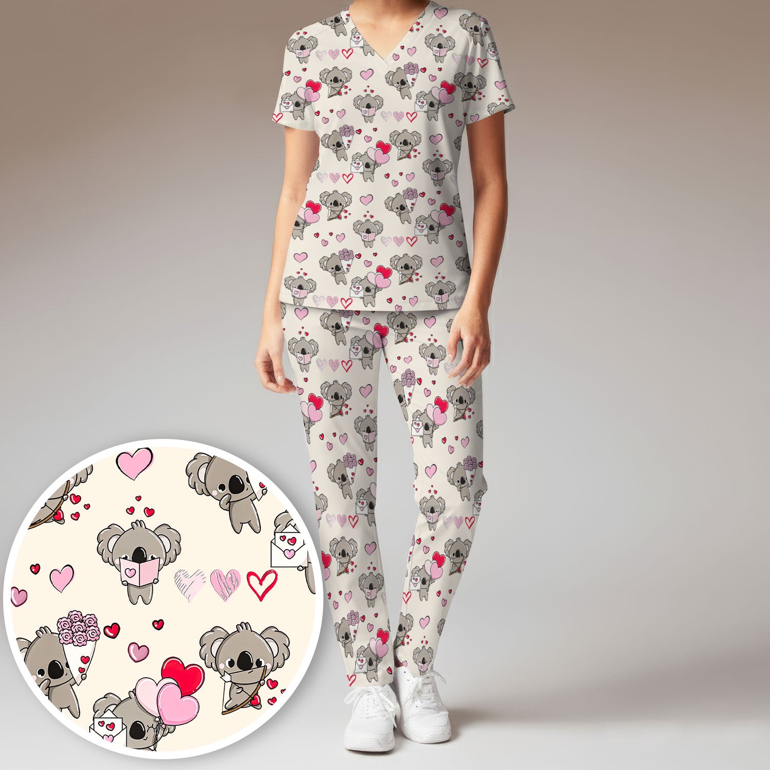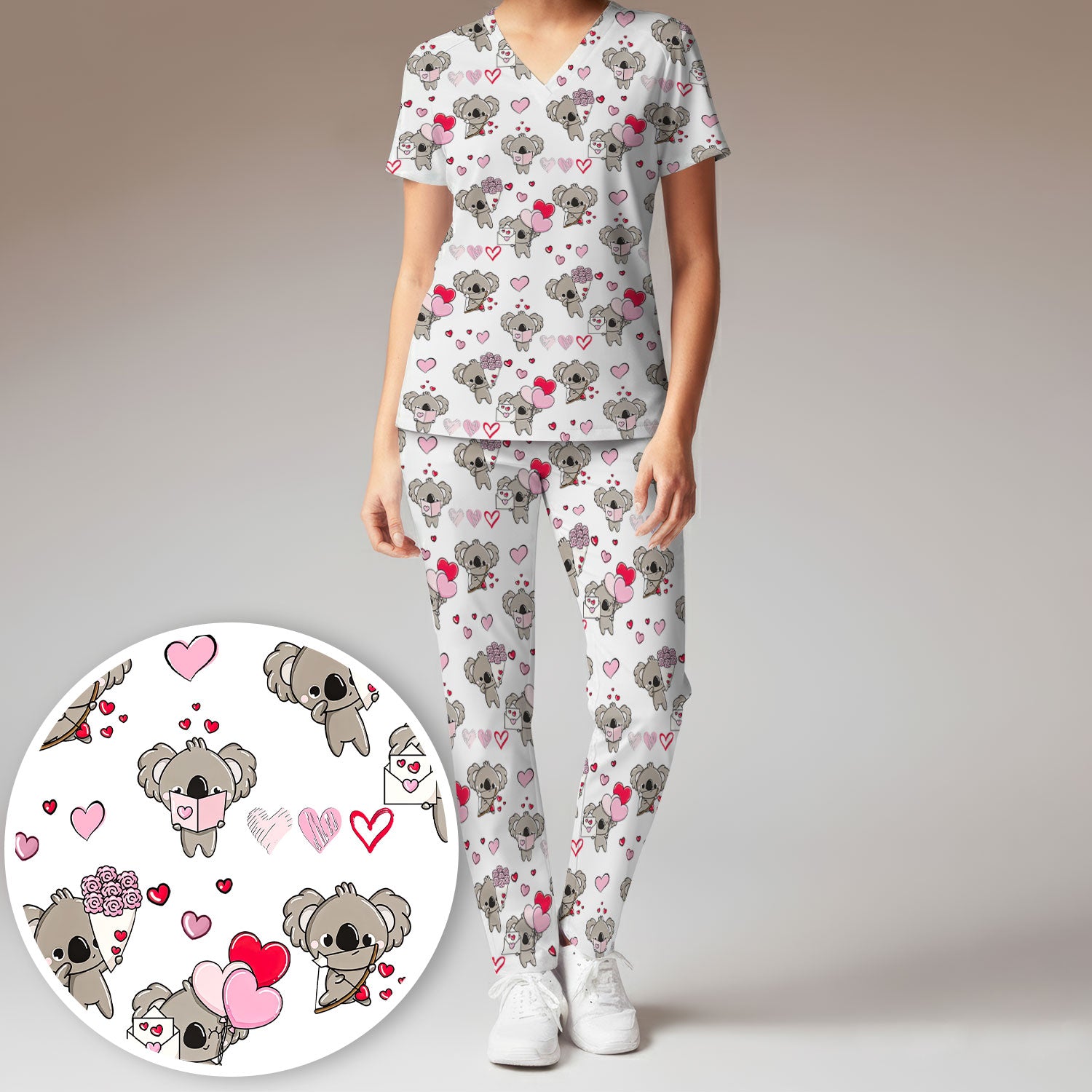 Valentine Koala Holding Flowers Cute Print Scrub, Women's Scrub Sets