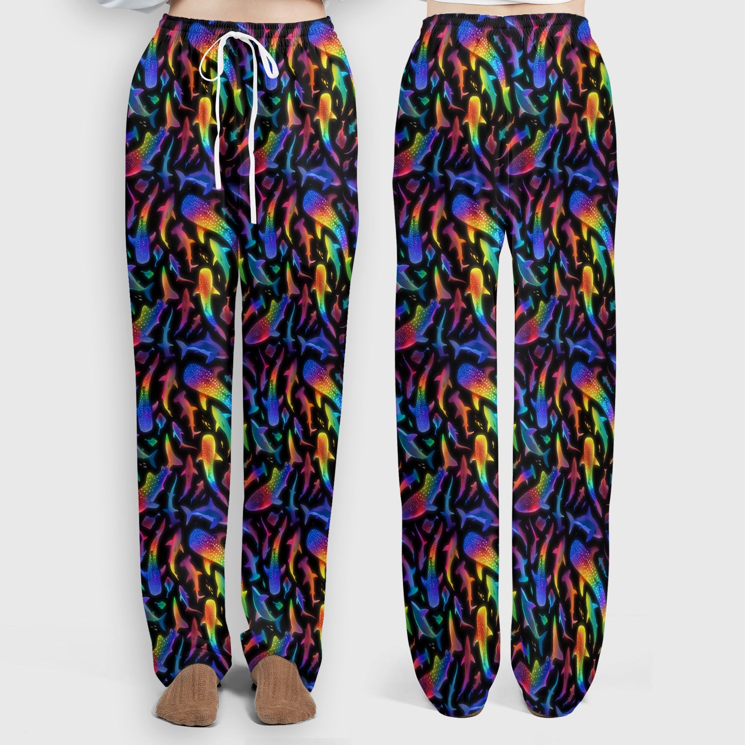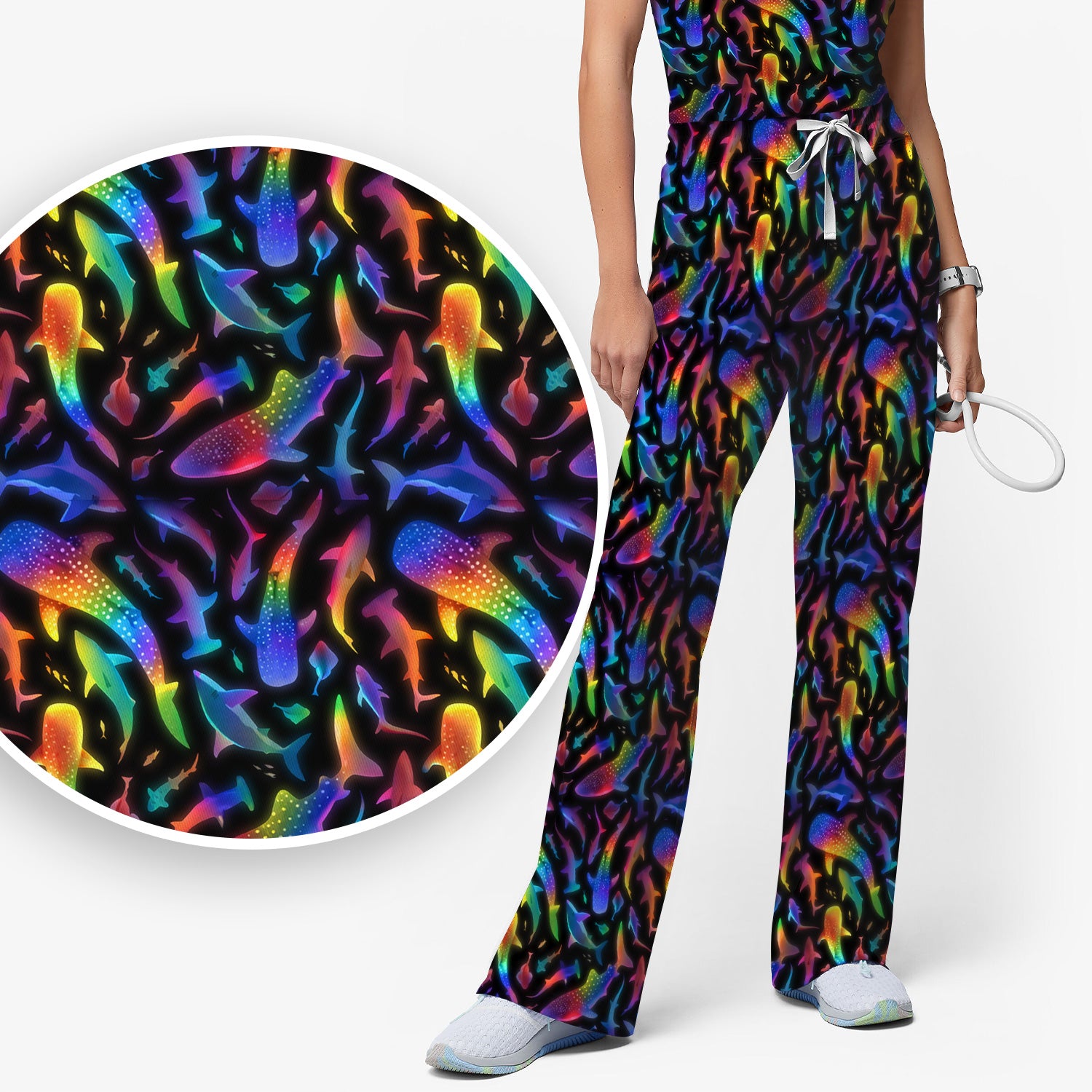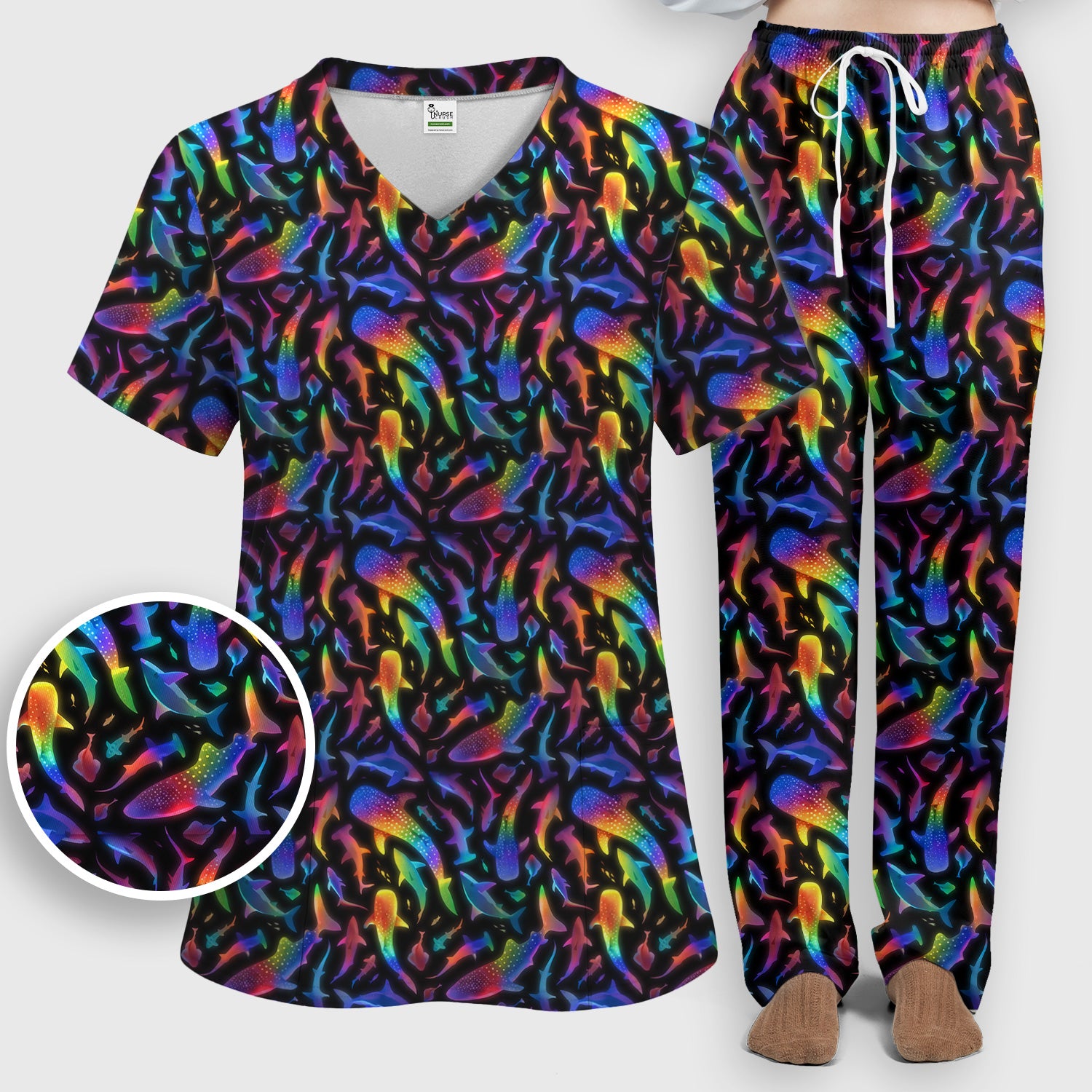 Vibrant Rainbow Shark Pattern Scrub Set, Scrub Pants and V Neck Top